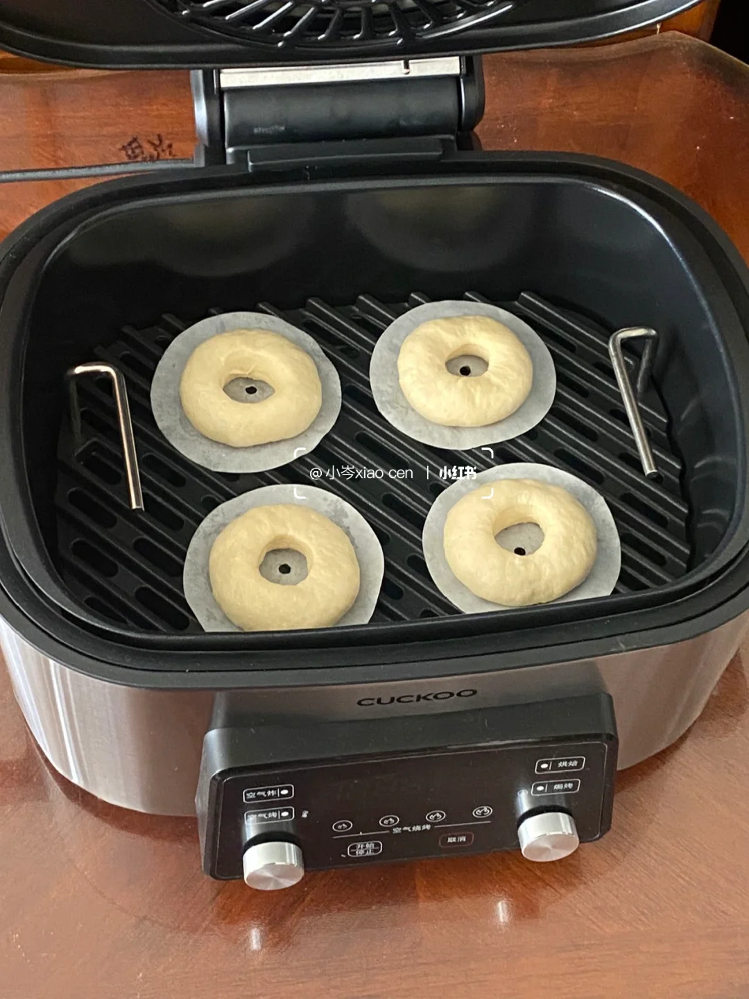 4.取一个面团,按扁,用模具或瓶盖戳洞,放在油纸上,表面喷水,温暖湿润处(32度左右)发酵20分钟至1.5倍大。