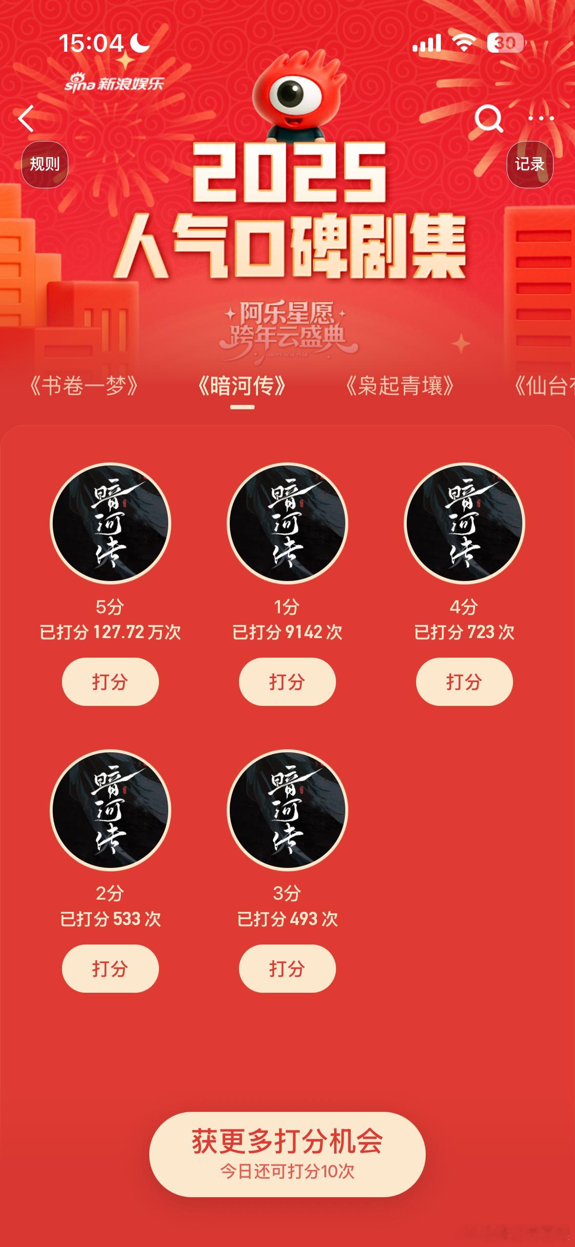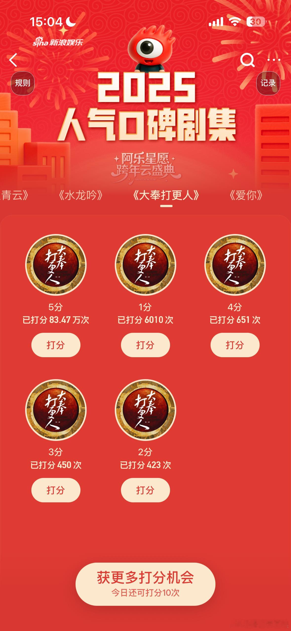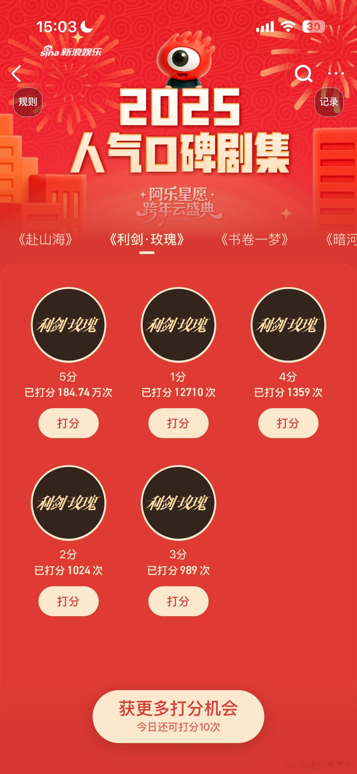 书卷一梦打分人数破三百万 “2025人气口碑剧”评分赛倒计时一天!《书卷一梦》打5分人数破三百万,目前每部剧均分排位如下,点击助力改变战局:2025人气口碑剧《仙台有树》《水龙吟》《利剑·玫瑰》《暗河传》《大奉打更人》《赴山海》《爱你》《入青云》《枭起青壤》《书卷一梦》