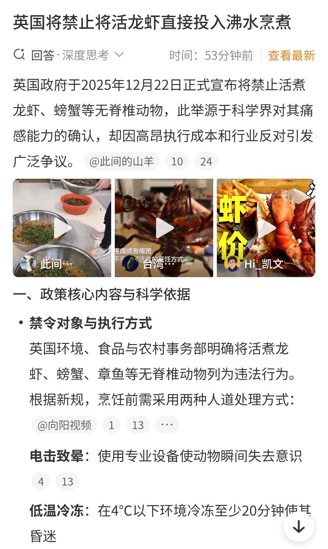 英国将禁止将活龙虾直接投入沸水烹煮 不能直接投入沸水煮,但是可以电晕或冻晕后再吃!也不知道英国人是怎么认定的这样龙虾更舒服?可能是英国有人属龙虾吧