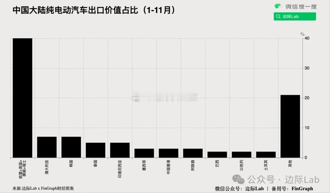 欧盟及英国、挪威、瑞士等欧洲发达经济体在今年前11个月占据了中国纯电动汽车出口约40%的份额。相比之下,受高关税与非贸易壁垒封锁,中国纯电动汽车对美国(0.03%)及加拿大(0%)的出口已实质性归零,对日本出口也仅占1.6%。来源:边际Lab x FinGraph财经图集