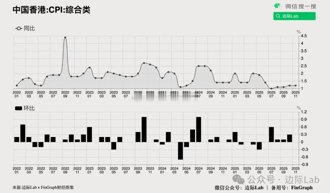 香港11月CPI同比增速维持在1.2%,与10月持平,处于今年7月以来的相对高位。从分项看,食品和交通相关价格涨幅有所加快,叠加服装价格跌幅收窄,对通胀形成一定拉动,但公共事业价格继续同比下降、部分服务价格涨幅放缓,对整体CPI形成拖累。住房、杂项商品及耐用品价格同比基本稳定,显示需求端缺乏明显推升力量。环比方面,11月CPI持平,继10月上涨0.3%后动能明显放缓。剔除政府一次性纾困措施后的基础通胀同比仍为1.0%,连续两个月未变,反映内生价格压力偏弱。来源:边际Lab x FinGraph财经图集