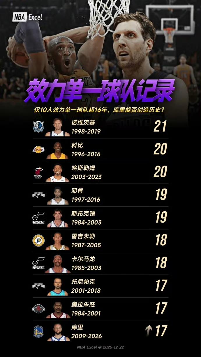 NBA单支球队效力时长记录:仅10人在同一球队效力超16年,库里能否书写历史? 诺维茨基(独行侠):1998 - 2019,效力21年 科比(湖人):1996 - 2016,效力20年 哈斯勒姆(热火):2003 - 2023,效力20年 邓肯(马刺):1997 - 2016,效力19年 斯托克顿(爵士):1984 - 2003,效力19年 雷吉米勒(步行者):1987 - 2005,效力18年 卡尔马龙(爵士):1985 - 2003,效力18年 托尼帕克(马刺):2001 - 2018,效力17年 奥拉朱旺(火箭):1984 - 2001,效力17年 库里(勇士):2009 - 2026,效力17年(持续增加中) 篮球史排名 诺维茨基 独行侠队史记录