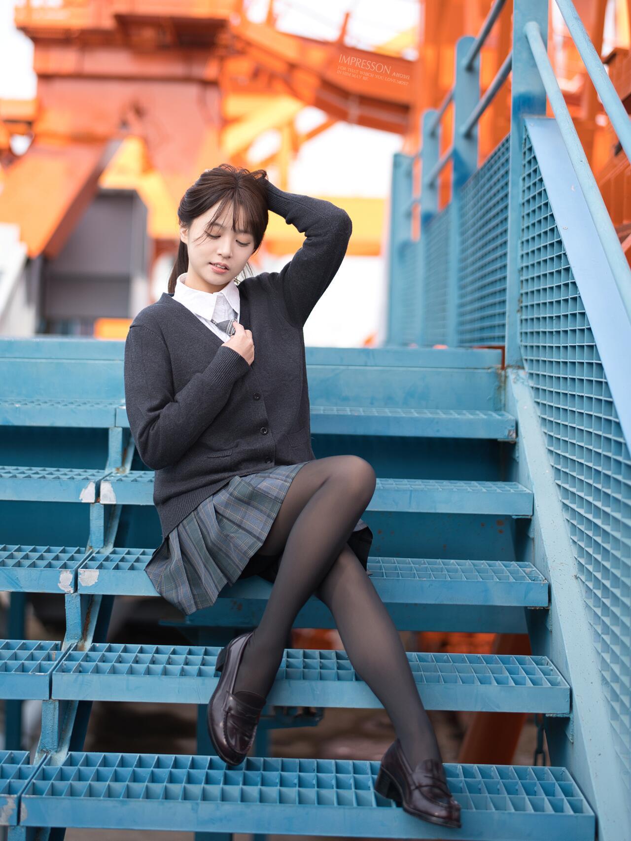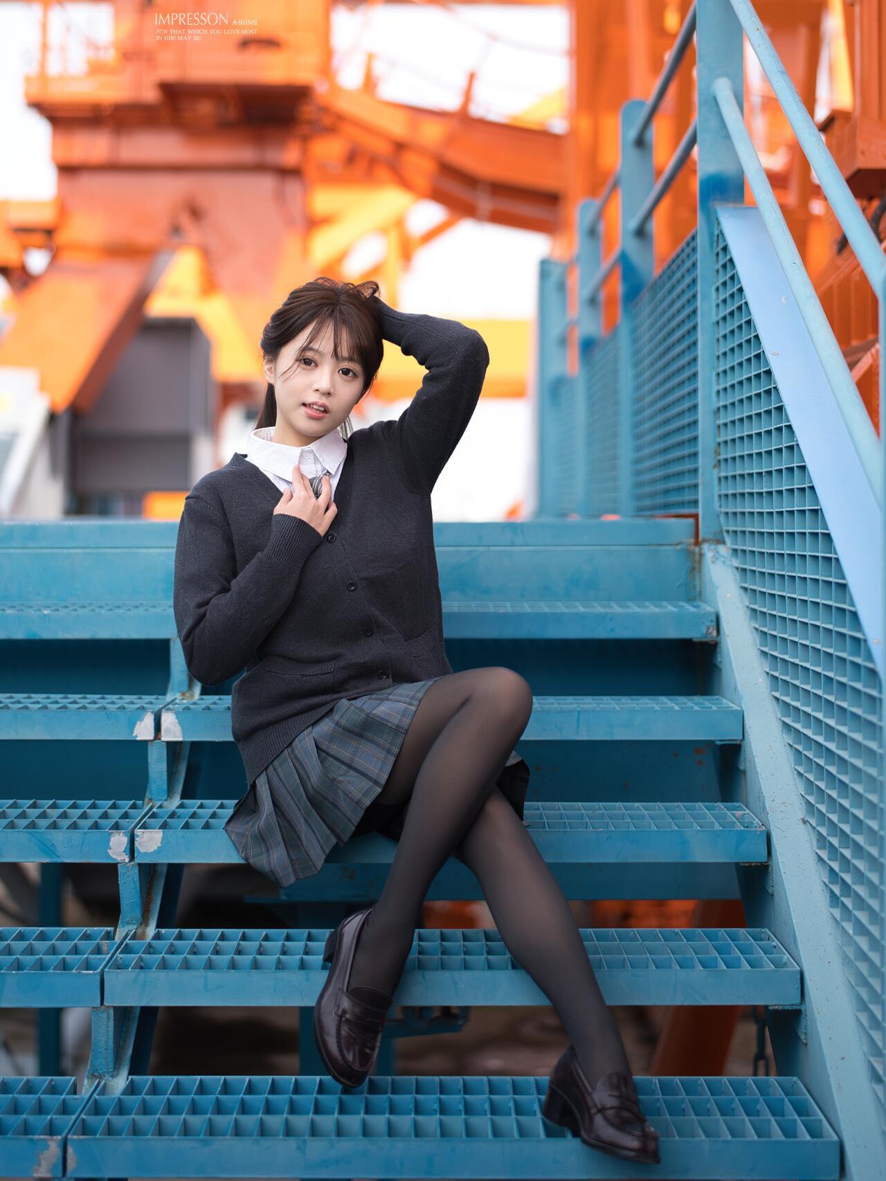 青春洋溢的校园少女,坐在蓝色楼梯上,阳光洒满整个画面。