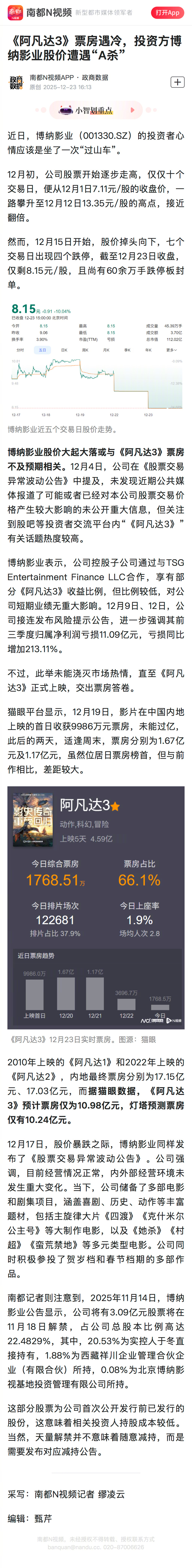 #阿凡达3票房不及预期#【《阿凡达3》票房遇冷,投资方博纳影业股价遭遇“A杀”】 #博纳影业股价暴跌#近日,博纳影业(001330.SZ)的投资者心情应该是坐了一次“过山车”。12月初,公司股票开始逐步走高,仅仅十个交易日,便从12月1日7.11元/股的收盘价,一路攀升至12月12日13.35元/股的高点,接近翻倍。然而,12月15日开始,股价掉头向下,七个交易日出现四个跌停,截至12月23日收盘,仅剩8.15元/股,且尚有60余万手跌停板封单。博纳影业股价大起大落或与《阿凡达3》票房不及预期相关。12月4日,公司在《股票交易异常波动公告》中提及,未发现近期公共媒体报道了可能或者已经对本公司股票交易价格产生较大影响的未公开重大信息,但关注到股吧等投资者交流平台内“《阿凡达3》”有关话题热度较高。博纳影业表示,公司控股子公司通过与TSG Entertainment Finance LLC合作,享有部分《阿凡达3》收益比例,但比例较低,对公司短期业绩无重大影响。12月9日、12日,公司接连发布风险提示公告,进一步强调其前三季度归属净利润亏损11.09亿元,亏损同比增加213.11%。不过,此举未能浇灭市场热情,直至《阿凡达3》正式上映,交出票房答卷。猫眼平台显示,12月19日,影片在中国内地上映的首日收获9986万元票房,未能过亿,此后的两天,适逢周末,票房分别为1.67亿元及1.17亿元,虽然位居日票房榜首,但与前作相比,差距较大。2010年上映的《阿凡达1》和2022年上映的《阿凡达2》,内地最终票房分别为17.15亿元、17.03亿元,而据猫眼数据,《阿凡达3》预计票房仅为10.98亿元,灯塔预测票房仅有10.24亿元。南都N视频记者 缪凌云