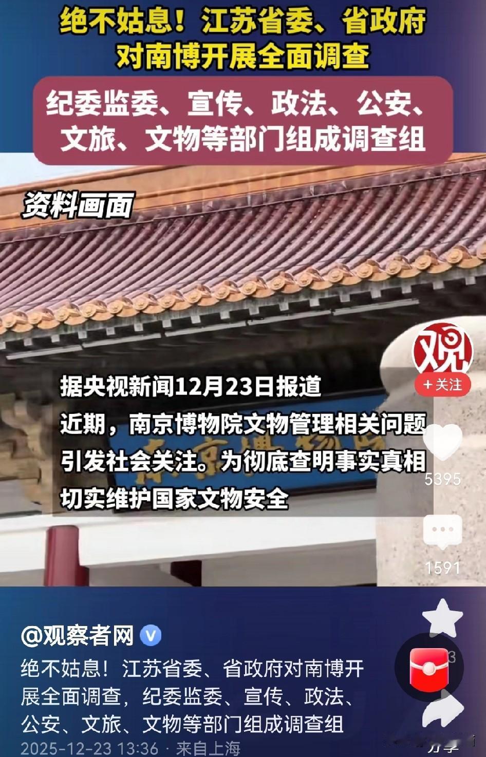 绝不姑息! 看来这要是动真格了! 江苏省委,省政府要对南博事件进行彻查, 并且这次的调查组由纪委监委、宣传、政法、公安、文旅、文物等部门组成,可见对此事相当的重视。 南博事件在发酵了几天之后,尤其是庞书令通过多个媒体发声,以及南博退休职工42人的联名举报,让这件事情在网络上引起了更大的影响。 从此前的姚院长为了保护文物而被迫上吊,到这位院长被举报,差距确实有点大,如果只是蜻蜓点水,似乎对不起前辈的付出。