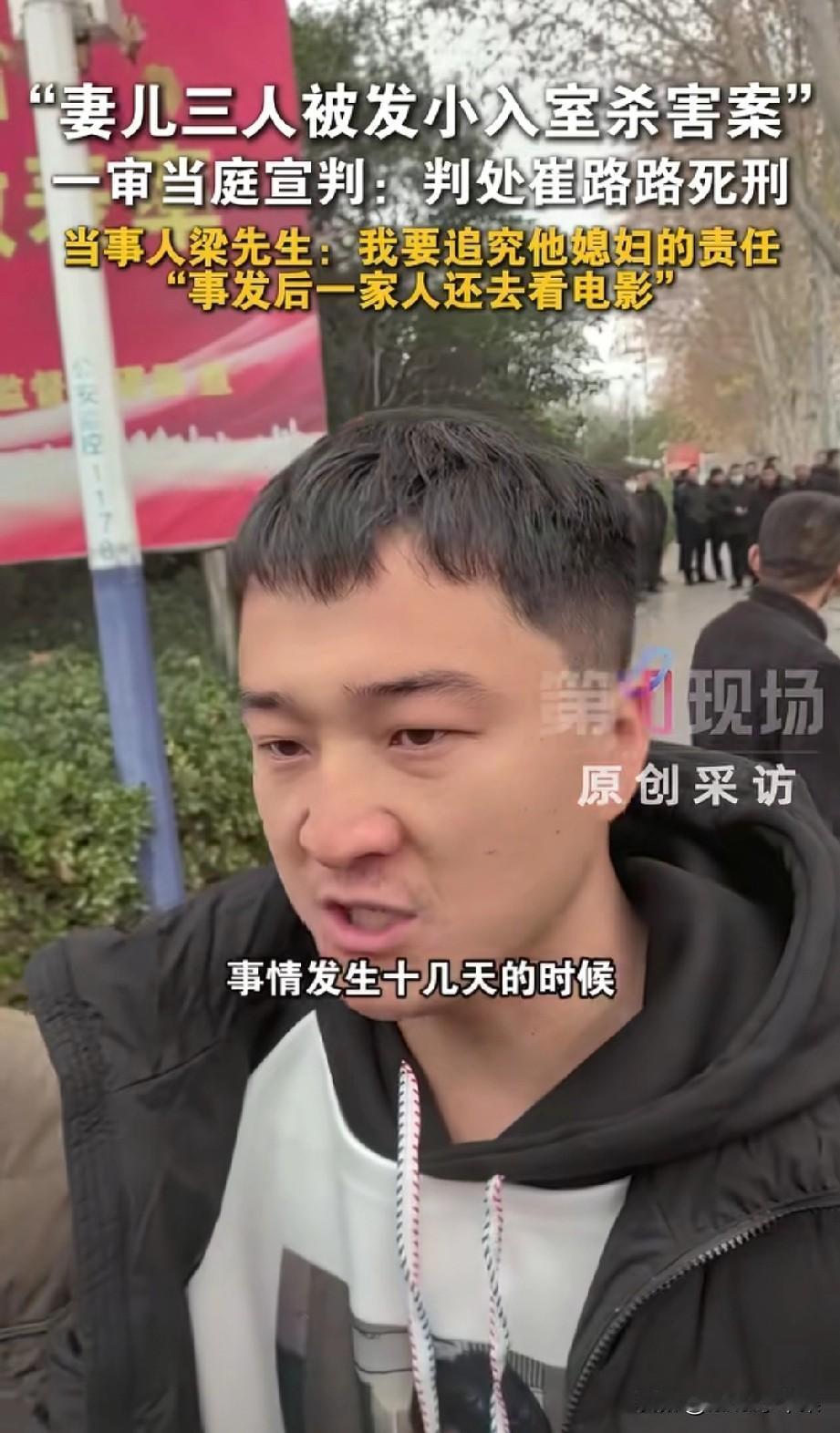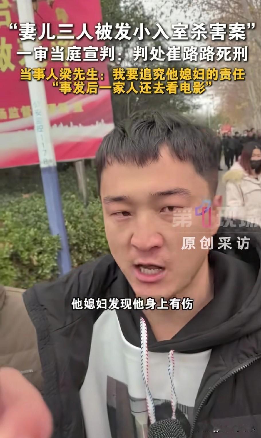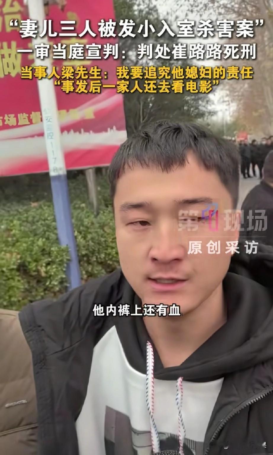发小杀害妻女案庭审结束,才发现比崔某某更可怕的是他的媳妇! “他身上有伤、内裤有血,我要追究他媳妇!”这是“妻女被发小杀害案”被害人丈夫梁先生气愤走出某院后说的第一句话! 12月23日,妻女被发小杀害案开庭并当庭宣判,崔某某被判死刑且当庭表示不上诉。庭审结束,被害人丈夫梁先生红着眼眶走出某院,面对媒体镜头,气愤表示:“我要追究他媳妇!行完凶他回到家,他媳妇第一时间发现他后背有伤,内裤有血,但他们一家人还装作什么也没发生一样去看电影!” 据媒体报道,经审理查明:被告人崔某某于2025年7月26日凌晨两时许,用事先偷配的钥匙偷偷潜入梁先生家行窃,翻找财物过程中惊醒梁先生妻子和一双儿女,崔某某为逃避罪责,使用刀砍、捅刺、包带勒颈等手段,将三人残忍杀害,并劫走马某某佩戴的黄金饰品! 经过与崔某某面对面的庭审,梁先生终于确认,崔某某就是冲着黄金去的,同时梁先生也终于清醒地认识到:崔某某就是一只恩将仇报的白眼狼,而比崔某某更可怕的是他的媳妇!或许崔某某媳妇很早就知情,且一直在包庇崔某某。下一步,梁先生将追究崔某某责任! 果然,同一个被窝里睡不出两种人!自己老公杀了人,自己还能开心地去看电影,这心理到底是有多强大多恶毒?!从小玩到大的发小,谁能想到?谁又敢相信?为了几条黄金饰品残忍要了三条人命,还是自己好朋友的妻女!或许,从一开始,就只有梁先生自己将崔某某当做发小好兄弟,在崔某某眼里,梁先生一家只不过是自己眼里随时可以占到便宜的酒肉提款机!通过这个事件,希望所有人都能引以为戒,交友一定要慎重,千万不要和品行不端的人走的太近,否则,最终不仅会害了自己,还可能祸及家人,为整个家族带来无妄之灾!妻儿3人被发小杀害男子发声