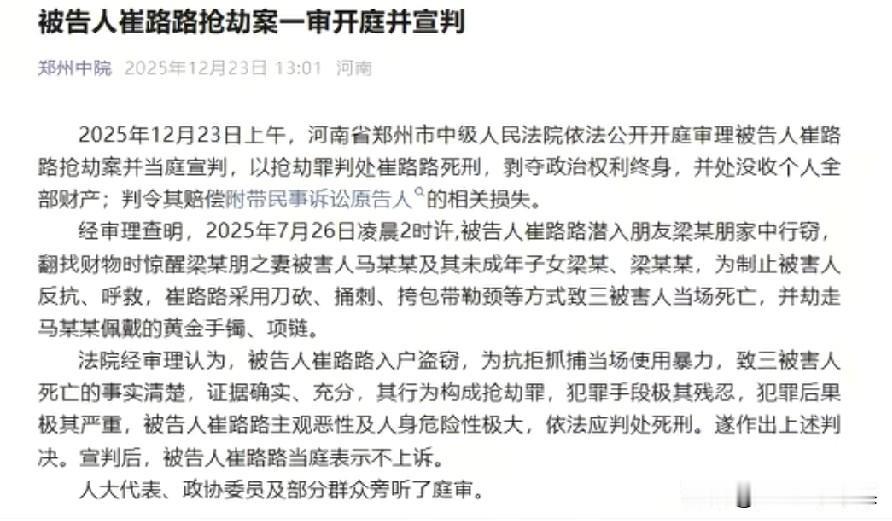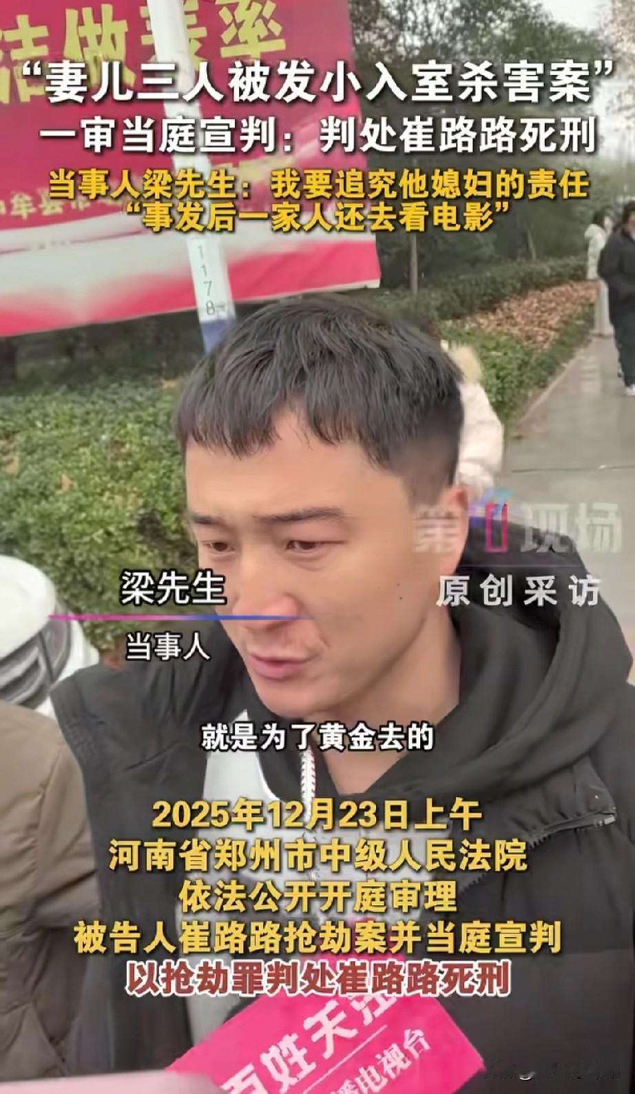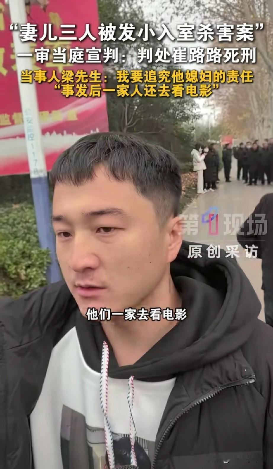 发小杀害妻女案庭审结束,才发现比崔某某更可怕的是他的媳妇! “他身上有伤、内裤有血,我要追究他媳妇!”这是“妻女被发小杀害案”被害人丈夫梁先生气愤走出某院后说的第一句话! 12月23日,妻女被发小杀害案开庭并当庭宣判,崔某某被判死刑且当庭表示不上诉。庭审结束,被害人丈夫梁先生红着眼眶走出某院,面对媒体镜头,气愤表示:“我要追究他媳妇!行完凶他回到家,他媳妇第一时间发现他后背有伤,内裤有血,但他们一家人还装作什么也没发生一样去看电影!” 据媒体报道,经审理查明:被告人崔某某于2025年7月26日凌晨两时许,用事先偷配的钥匙偷偷潜入梁先生家行窃,翻找财物过程中惊醒梁先生妻子和一双儿女,崔某某为逃避罪责,使用刀砍、捅刺、包带勒颈等手段,将三人残忍杀害,并劫走马某某佩戴的黄金饰品! 经过与崔某某面对面的庭审,梁先生终于确认,崔某某就是冲着黄金去的,同时梁先生也终于清醒地认识到:崔某某就是一只恩将仇报的白眼狼,而比崔某某更可怕的是他的媳妇!或许崔某某媳妇很早就知情,且一直在包庇崔某某。下一步,梁先生将追究崔某某责任! 果然,同一个被窝里睡不出两种人!自己老公杀了人,自己还能开心地去看电影,这心理到底是有多强大多恶毒?!从小玩到大的发小,谁能想到?谁又敢相信?为了几条黄金饰品残忍要了三条人命,还是自己好朋友的妻女!或许,从一开始,就只有梁先生自己将崔某某当做发小好兄弟,在崔某某眼里,梁先生一家只不过是自己眼里随时可以占到便宜的酒肉提款机!通过这个事件,希望所有人都能引以为戒,交友一定要慎重,千万不要和品行不端的人走的太近,否则,最终不仅会害了自己,还可能祸及家人,为整个家族带来无妄之灾!妻儿3人被发小杀害男子发声