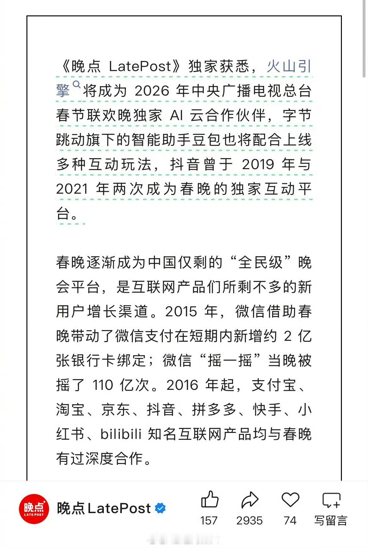 抖音集团拿下春晚独家AI云合作,火山引擎和豆包要上春晚了