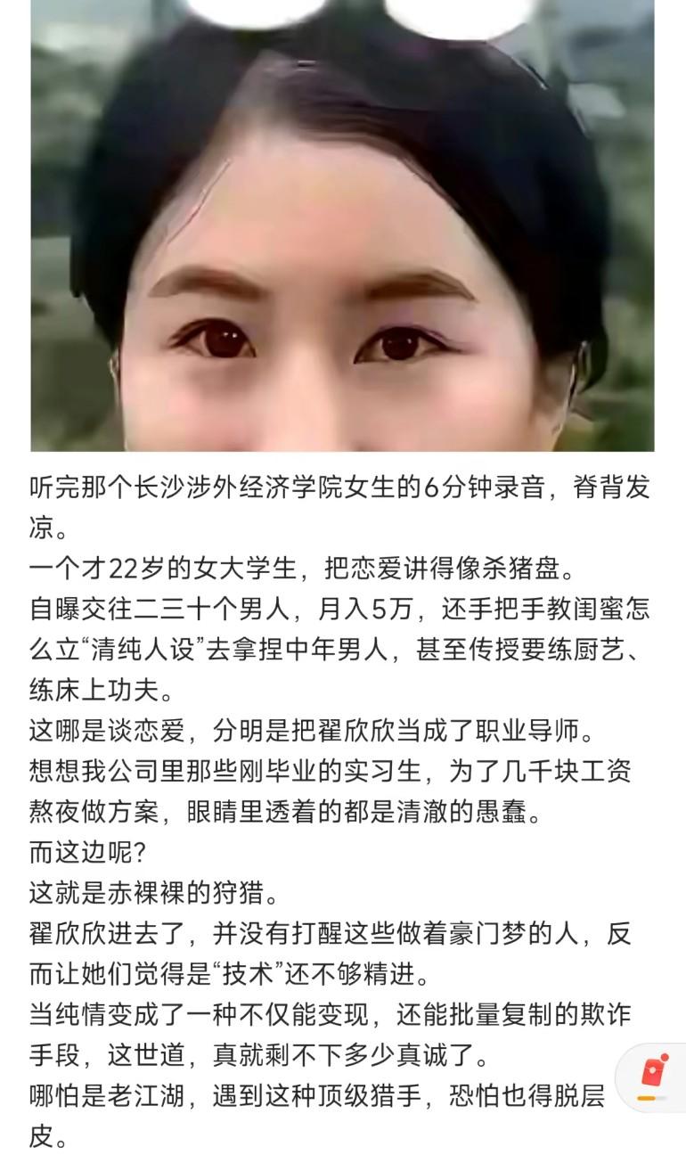 听完那个长沙涉外经济学院女生的6分钟录音,脊背发凉一个才22岁的女大学生,把恋爱讲得像杀猪盘! 很多女大学生“谈恋爱”的对象根本就不是男大学生,爹系男友才是目标。其实和包养没区别。人家是在死亡赛道上狂飙,碰到狠人就知道错了。现在有钱的有几个是傻的?给他们玩心眼。怎么死的都不知道。这种事儿一多。他们能不防备?