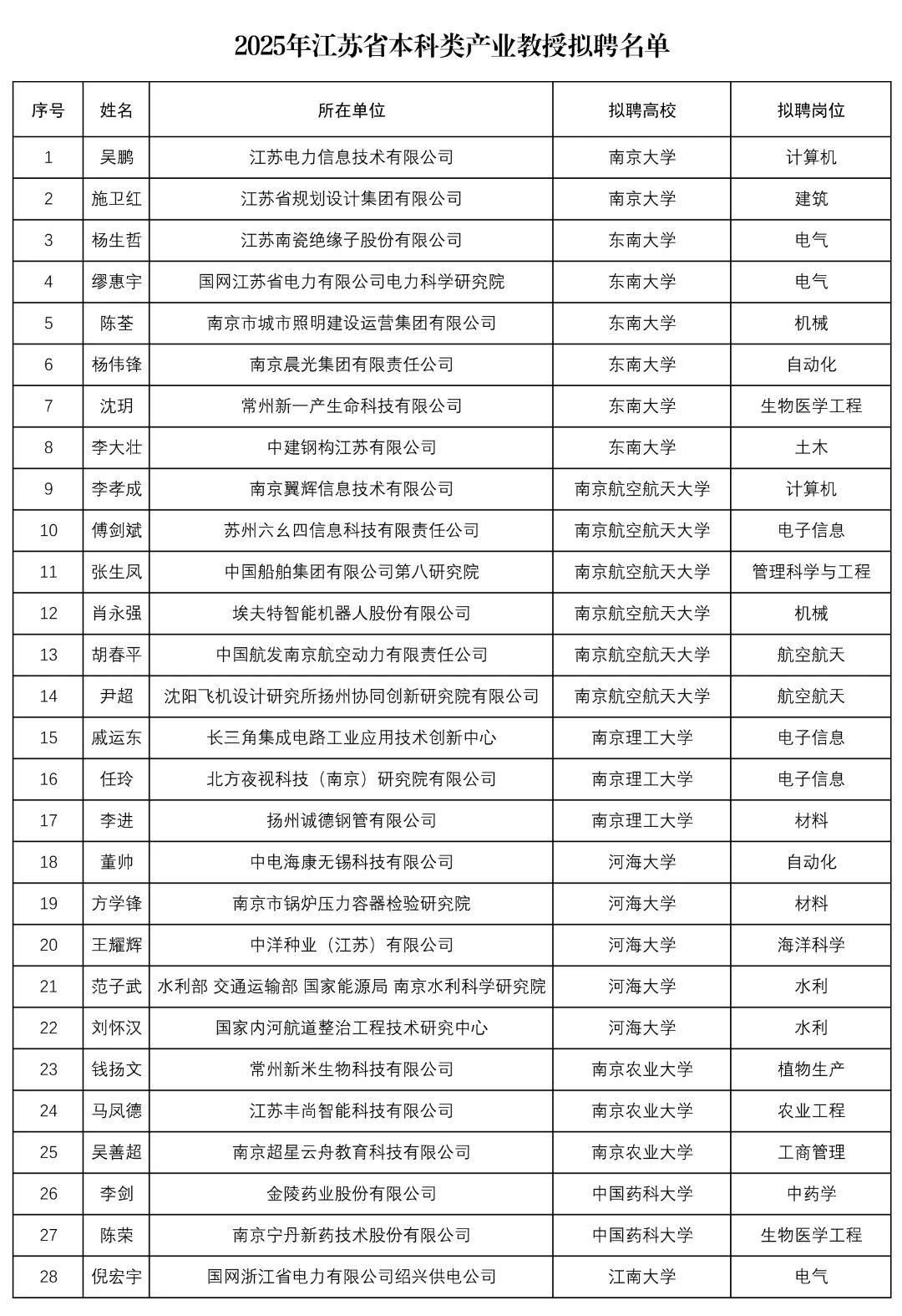江苏盐城:选聘结果公示 12月22日江苏省产业教授选聘办公室发布2025年江苏省产业教授(兼职)选聘结果公示根据《省教育厅等四部门关于开展2025年江苏省产业教授(兼职)选聘工作的通知》(苏教研函〔2025〕9号),在岗位发布、个人申报、高校推荐、资格审核的基础上,省教育厅组织专家对2025年江苏省产业教授(兼职)申报材料进行了审核,现将本科类和研究生导师类产业教授选聘结果予以公示。 公示时间为2025年12月22日至2025年12月26日。 任何单位和个人如对选聘结果有异议,请在公示期内以书面形式向省产业教授选聘办公室反映,并提供必要的佐证材料,以便核实查证。提出异议者须提供本人真实姓名、工作单位、联系电话等有效联系方式。凡匿名、冒名或超出期限的异议不予受理。 江苏省本科类产业教授选聘工作 联系人:王伟, 联系电话:025-83335450,025-83335057, 电子邮箱:jsjyt_gjc@163.com。江苏省研究生导师类产业教授选聘工作 联系人:沈春, 联系电话:025-83335660,025-83335057, 电子邮箱:jsyjsjy@ec.js.edu.cn。 附件: 1. 2025年江苏省本科类产业教授拟聘名单 2. 2025年江苏省研究生导师类产业教授拟聘名单