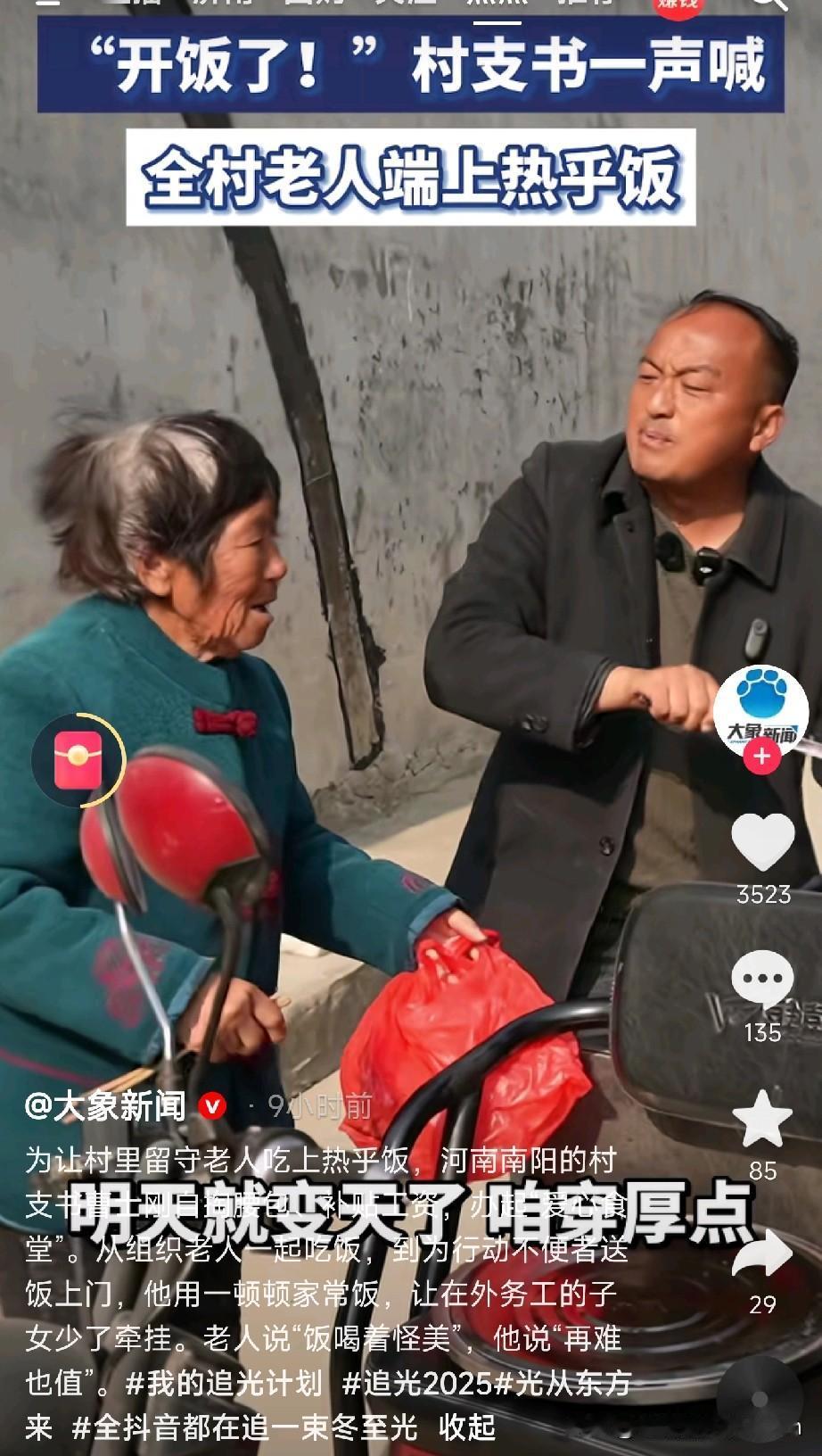 老百姓心中的好干部 南阳镇平范营村的父老乡亲们有福啦!村支书曹士刚真是操碎了心!为了让村里留守老人吃上热乎饭,他自掏腰包贴工资,硬是办起了“爱心食堂”。 每天中午,食堂里坐得满满当当,70岁以上的老人、留守儿童、五保户都能免费吃上热乎饭!红烧肉炖得烂乎,青菜炒得清甜,老人们端着碗直夸:“饭喝着怪美!” 对行动不便的老人,曹支书更是贴心,带着志愿者挨家挨户送饭上门!烈日下、风雪里,那辆小三轮跑遍村头巷尾,车斗里保温桶的温度,暖到了老人的心坎里! 为了补贴食堂开销,曹支书下了班还跑顺风车、拼单拉活,用私房钱贴补集体账。有人问他累不累,他抹把汗说:“咱当干部的,再难也值!能让在外打工的娃们少操点心,比啥都强!” 食堂食材来自村爱心菜园,米面油是村企业赞助,连厨师都是乡亲们轮着当志愿者!如今,越来越多爱心人士和企业主动捐助,这爱心食堂越办越红火! 老人吃得香,儿女在外闯,心都踏实!这样的村支书,是不是咱老百姓心中的好干部? (文章素材来自大象新闻,侵删)