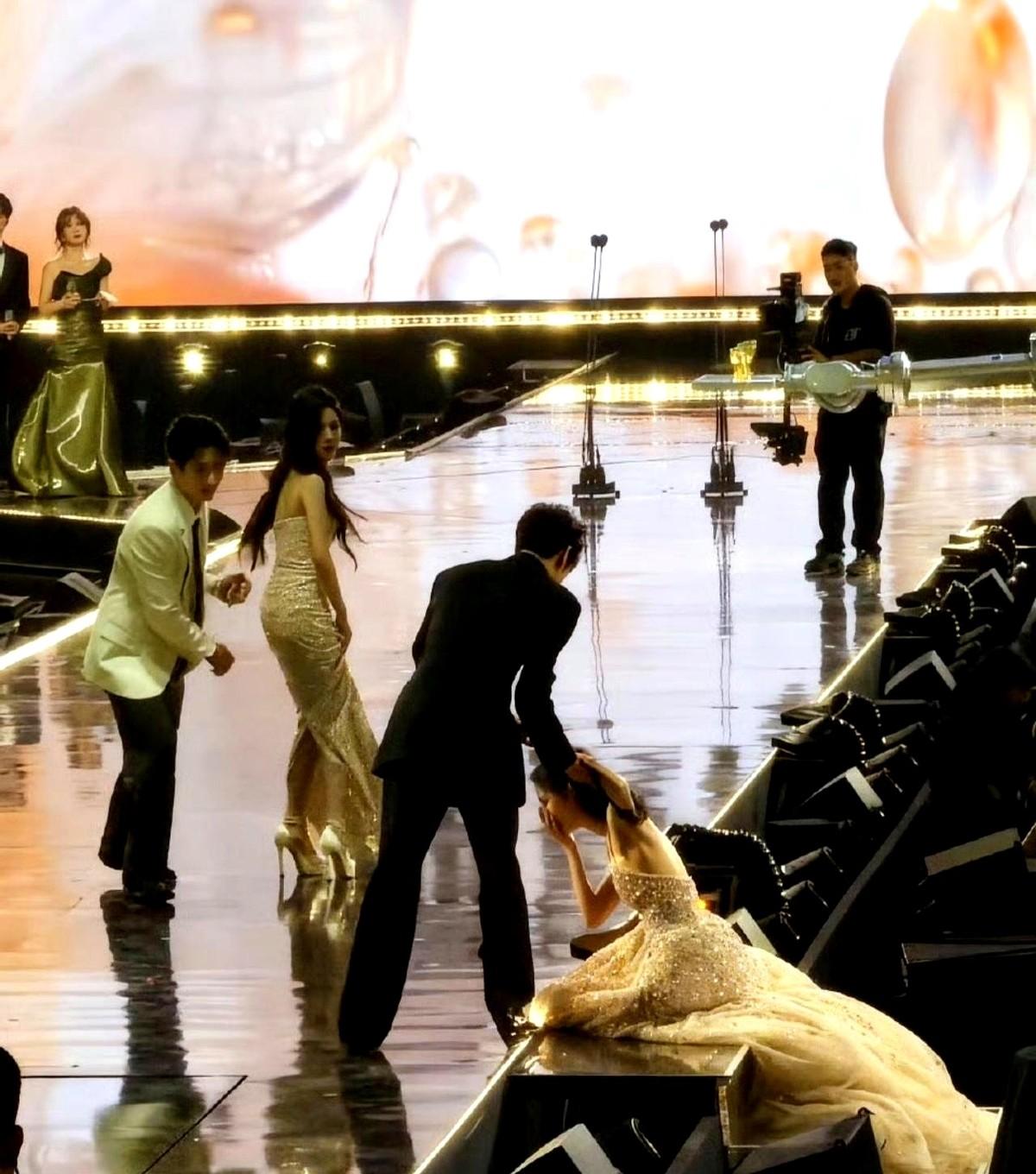 孟子义这一摔,直接摔成了年度神图。 2025年12月21日海南海口的星光大赏,孟子义跟着《尚公主》剧组领“年度最受期待剧集”奖。结果高跟鞋一勾裙摆,她整个人单膝重重磕在台阶上,那声音听着都疼。 可摄影师抓拍的瞬间绝了,白色鱼尾裙散开像花瓣,发丝飞扬,网友直呼“摔倒界天花板”,堪比詹妮弗·劳伦斯奥斯卡那一跤。这意外的美感,真不是演出来的。 旁边李昀锐慌张去扶,下台还紧盯她裙子,领奖感言里特意感谢“孟姐”。他俩CP话题“昀牵孟绕”阅读量直接破亿。台下丁禹兮老远都站起来了,想隔空扶一把那种。 她自己心态好,心态特别好。爬起来就自嘲去年也摔了,一句话把尴尬化解。事后发微博说“挺疼的,就是太丢人了”,圈粉无数。 这事儿还带火了“摔跤爆剧玄学”。她2023年摔完,《九重紫》就爆了。这次一摔,《尚公主》预约量立马破150万,刷新了纪录。 这一摔把剧的热度摔满了,孟姐以后可得注意脚下,大家都心疼呢。