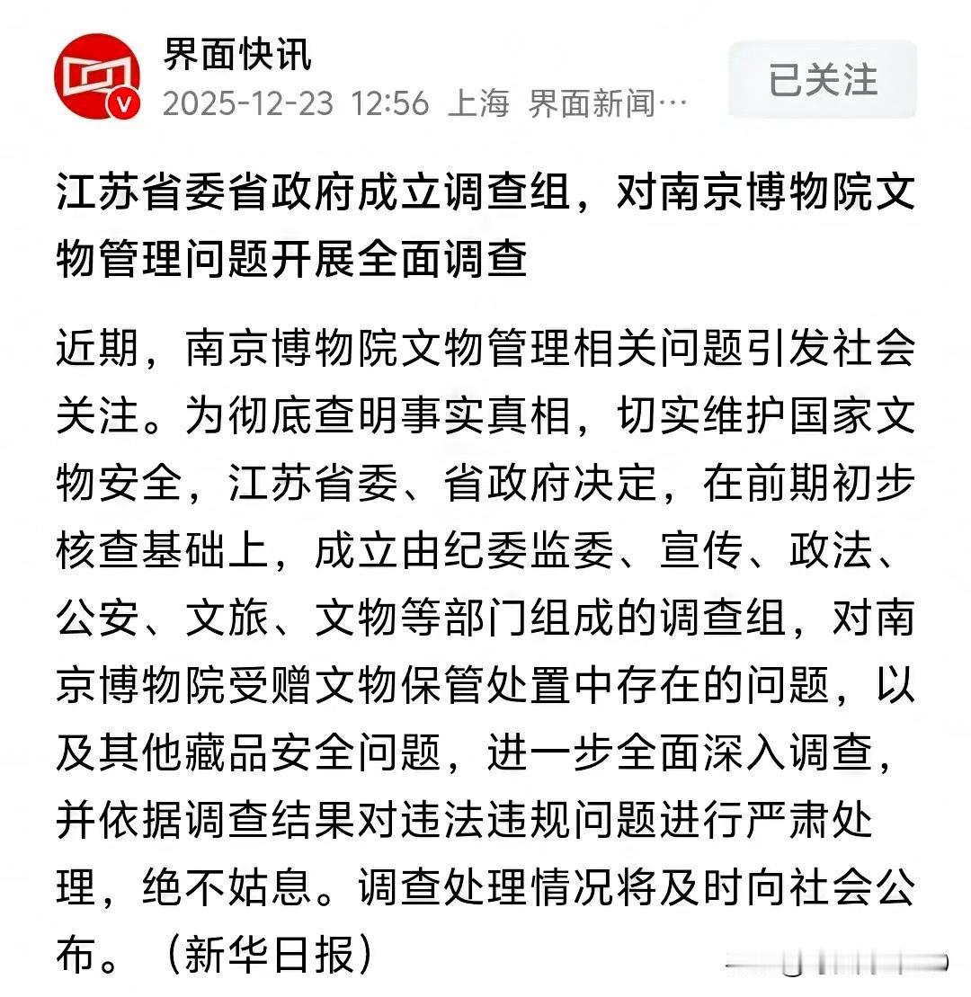 好事,国家文物局和江苏省政府都出手了,对南京博物院相关问题进行全面调查,此前南博还态度强硬,前馆长也一副毫不在乎的样子,把自己摘的一干二净,这下可真是碰到硬茬了,相信两部门强强联手,一定会把南博的问题查个水落石出,给社会一个满意的结果! 之前庞家后人举报捐赠的137幅古画里,5幅莫名失踪,其中仇英《江南春》图卷现身拍卖行,南博还嘴硬说这5幅是“伪作”,上世纪90年代就依法处置了。更气人的是前馆长,一句“不知情、不是我经手”就想把自己摘干净,完全无视捐赠人的知情权。 现在好了,国家文物局直接成立工作组赴南京核查,江苏省政府更是组建了纪委监委、公安、文旅等多部门调查组,要把受赠文物处置、馆藏安全等问题查个底朝天。这可不是走过场,而是冲着“绝不姑息”来的,硬茬遇上真监管,看谁还能蒙混过关。 我觉得这事的关键根本不是画作真伪,而是博物馆的底线在哪?捐赠人无偿献出珍贵文物,是信任国家会好好守护,可南博既没提前告知处置情况,也没提供清晰的流转记录,这哪是公益机构该有的样子? 文物是国家的瑰宝,更是公众的财富,博物馆不是“一言堂”,不能想怎么处置就怎么处置。这次两部门联手调查,不仅是给庞家一个交代,更是给所有文物捐赠者、给全社会一个承诺:文物管理容不得半点猫腻。 期待调查结果早日公布,不仅要查清这5幅画的去向,更要补上文物管理的漏洞。各位读者你们怎么看?欢迎在评论区讨论。