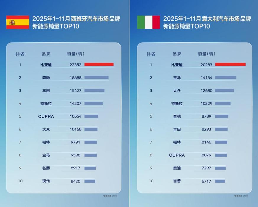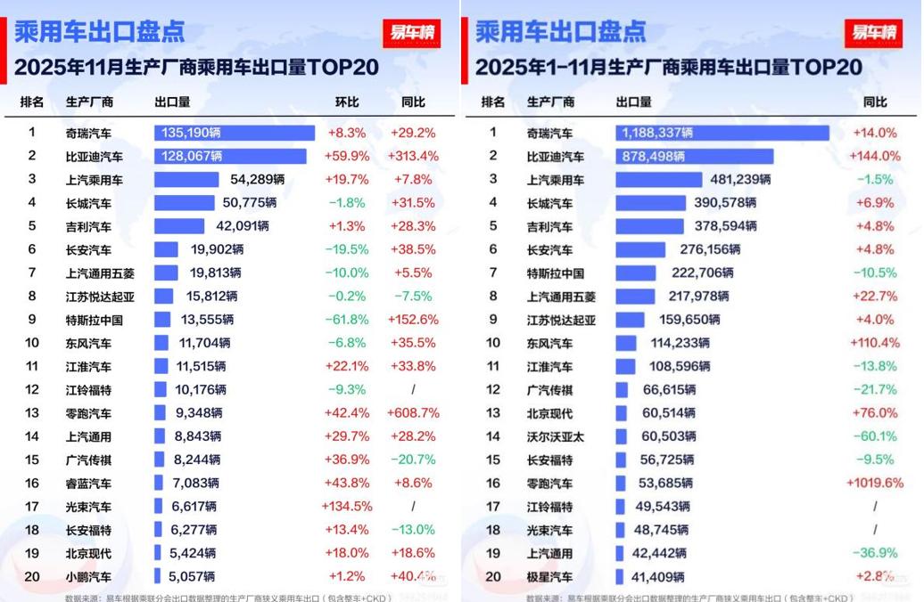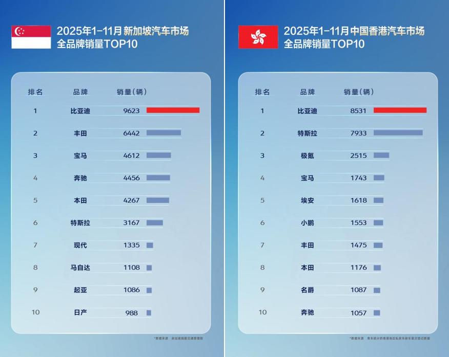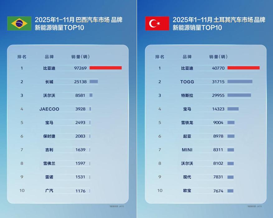 11月比亚迪全球多市场夺冠,全球化战略成绩斐然 比亚迪在海外可谓是喜讯不断!根据易车发布的数据来看,比亚迪在11月整整出口了12.8万台汽车,同比激增313.4%,而在1-11月累计出口量更是达到了87.8万台。不仅汽车出口量庞大,比亚迪还在全球多个市场拿下销冠成绩,不得不说全球市场表现堪称惊艳。 多国销冠全面超越!11月比亚迪在巴西、土耳其、意大利、西班牙、匈牙利、克罗地亚等国斩获新能源汽车销量冠军之位,在新加坡等国更是摘得全品牌销冠。不仅如此,1 - 11月在全球多个市场的累计销量表现也十分亮眼,在巴西、土耳其、西班牙、意大利等国,比亚迪位居新能源汽车品牌销量榜首。在新加坡、中国香港等地区市场,更位列全品牌销量第一,深受消费者青睐。 特别是,凭借着极高的热度和产品力,1-11月比亚迪在全球多个汽车核心国家市场的销量狠狠超越了特斯拉,例如英国、德国、意大利、西班牙、奥地利、爱尔兰、马来西亚、土耳其、新加坡、泰国、中国等。说白了,比亚迪的成功源于其深厚的技术积累与前瞻的战略布局。 从强大的技术鱼池、多元化产品矩阵,到“自建滚装船+本地化工厂”的全球供应链体系等,比亚迪正以新能源汽车领军者的姿态,加速驶向世界每个角落。时至今日,比亚迪新能源汽车已覆盖全球119个国家和地区,前不久比亚迪还举行了第1500万辆新能源汽车下线仪式!可以这么说,比亚迪已经成为了中国智造的闪亮名片,强势引领全球新能源发展!
