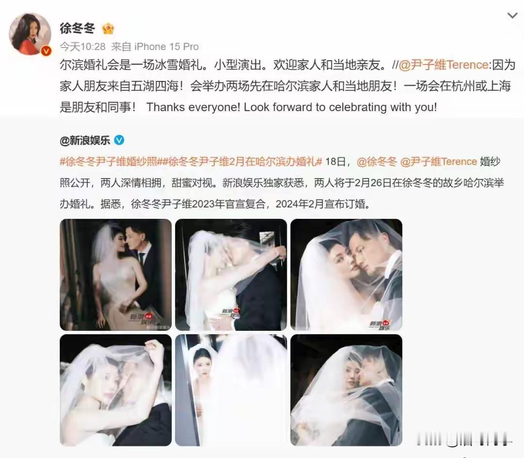 徐冬冬在微博分享了她与尹子维的婚纱照片,他们之前在一起拍拖过,不过后来不知道因为什么原因分手了,后于2023年官宣复合,2024年2月宣布订婚。徐冬冬是最早的“大嫂”扮演者,先前也拍摄过椰树椰汁的广告,尹子维一定是非常爱她,才会对她念念不忘,相信有情人终成眷属。不过话说回来,尹子维回头看镜头的眼神简直就是一个妥妥的反派专业户啊!他们经常会在抖音直播中学习英语,不知道大家看了没,尹子维的演技在线,英语也是不错的。徐冬冬 徐冬冬演技 徐知冬 徐冬冬旅行日记 徐冬艺 徐庆冬 张冬 杜晓冬