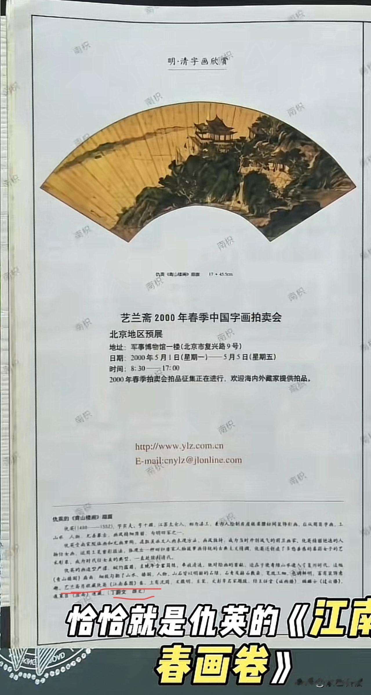 南京博物院文物拍卖案再添新线索。 今天《亚洲周刊》发文表示,有网友向其提供了仇英《江南春》流失的新证据。 证据表明:2000年《读者》杂志刊登了艺兰斋拍卖会的广告。广告声明中表明,2000年春季艺兰斋便已获得《江南春》画卷,而非南京博物院声明中所说的2001年。 拍卖展品介绍的撰写人是丁蔚文,她是陆挺的配偶。签字同意《江南春》移送江苏文物总店的南博院前院长徐湖平与陆挺是老相识,徐湖平是南京文物收藏协会会长,而陆挺是顾问。如此关联起来,《江南春》为何会被陆挺收藏便不难揣测了。 对于《亚洲周刊》给出的关于《江南春》拍卖案的最新声明,大家有何看法?欢迎在评论区交流。 (图片来源网络)