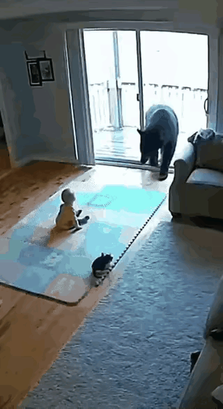 一个还不会走路的娃娃坐在门口,一头黑熊突然闯了进来。娃娃害怕的连连摆手,危机时刻身后的猫咪挺身而出,把小主人护在身后。或许黑熊以为这是一只缩小版的老虎,吓得落荒而逃。 网友评论: 小猫也害怕,它停顿了一下,但是为了小主人,它豁出了命也要冲在前,请以后善待这些小动物吧,大部分的小动物都是有灵性的 哎妈呀,太感动了,一个巴掌大的小毛孩子居然跳出来,保护我们人类的小娃娃,不是它不怕,而是它心里护主的一份爱呀 是监控摄像头拍下,绝非A1,为缩小版的“小老虎”点赞!