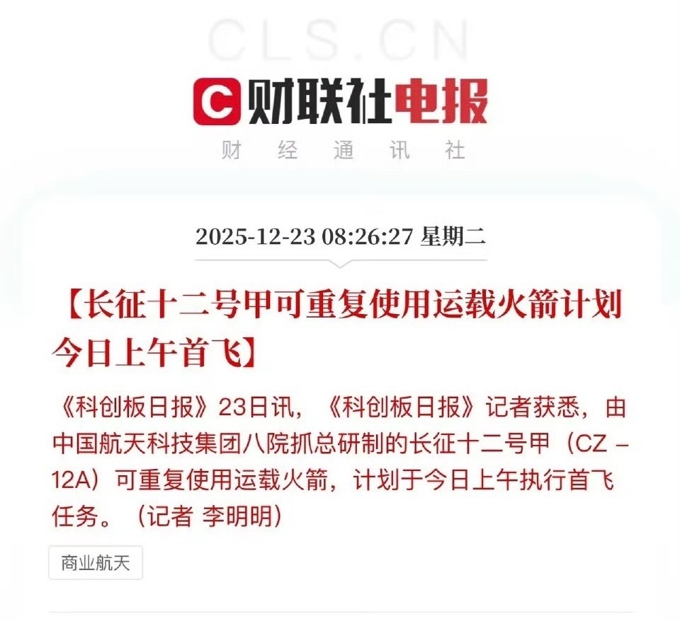 【长征十二号甲 首飞成功:但一级回收失败】 12月23日消息,今日上午10时许,
