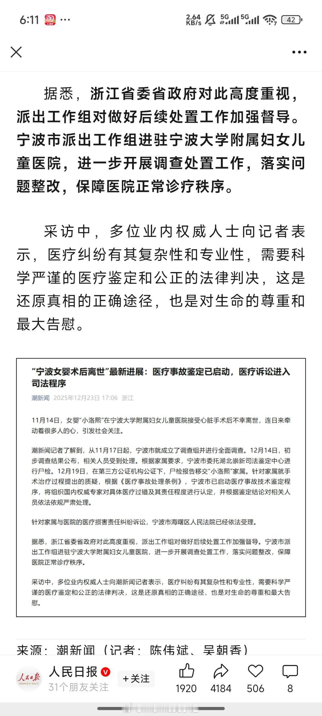 宁波女婴术后离世医疗事故鉴定启动国家队出手!高度重视!持续关注!