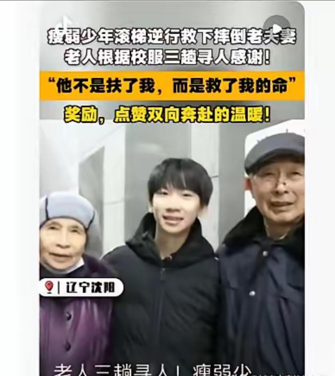 "不是扶了一下!"辽宁沈阳,八旬老两口出地铁站时不慎滚落电梯,一名初三男孩迅速逆行冲下将其扶起。 这电梯往上走得挺快,老人摔下去可不是闹着玩的,后面的人也得跟着遭殃。男孩听见喊声,啥也没想就往下冲。 这孩子叫高伟峻,育源中学初三的。那天他提前放学,正好撞见这事儿。他后来说,就想着赶紧把人扶起来,别的没考虑。 老两口都84了,摔得不轻,奶奶肋骨骨折。两人缓过劲儿就非要找到恩人,凭着校服上的校名,三次跑到学校去问。 高伟峻没收老人的2000块钱,说这是应该的。后来阿里公益奖了5000块,他全家一商量,全捐出去了,说要帮更多需要帮助的人。 这事儿挺暖心的。老人知恩图报,孩子纯粹善良,谁也没算计谁。现在社会不缺聪明人,就缺这种实在人。 做好事别老想着会不会被讹。这孩子没想那么多,老人也没让他寒心。人心换人心,善良碰上了感恩,这就是最实在的事儿。