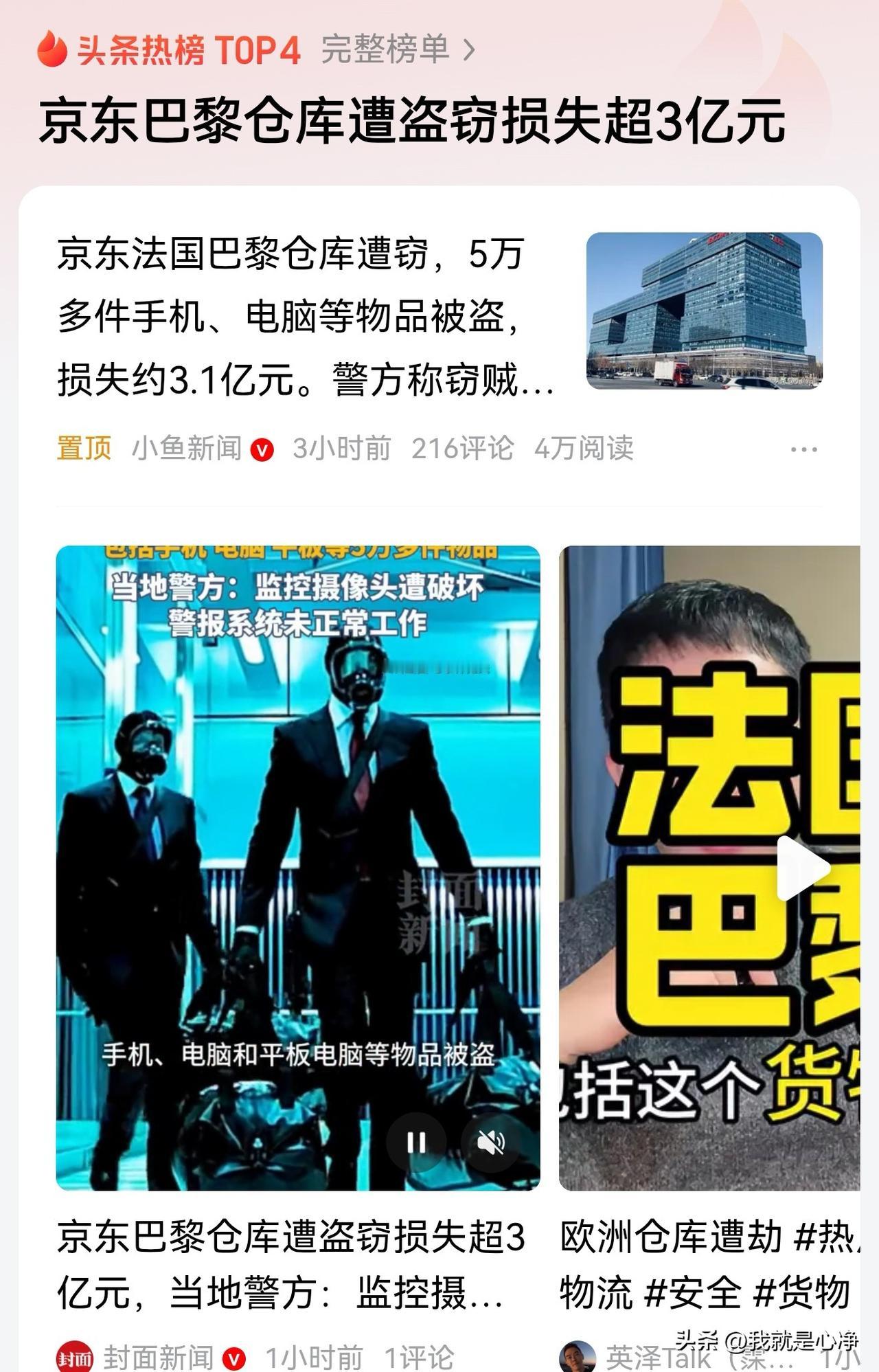 不偷不是意大利,不抢不是法兰西,又偷又抢英吉利,啪啪两枪大美丽! 这就是真实的西方世界。 您不要以为这是网络上的段子调侃。 京东公司在法国巴黎的仓库就被偷了,5万多件手机电脑等物品被盗走。 直接损失高达3.1亿元。 警方称窃贼破坏了监控设施直接闯进去进货了。 这是偷吗? 这不就是明抢吗? 中国人在西方人的眼里就是肥羊。 不光抢你的游客,连你的公司一样抢。 3.1亿元,得卖多少东西才能赚出来啊? 在国内赚点钱,跑到国外让人抢去。 千万别是监守自盗啊?不好说呀。