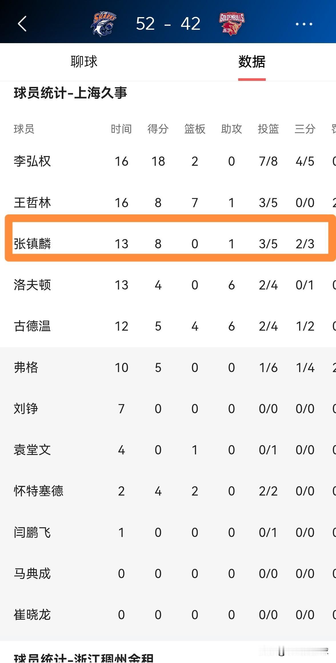 上海久事超级球星张镇麟终于发威了!在今天上海久事主场迎战浙江稠州金租的上半场比赛中,张镇麟首发出战13分钟,投篮5中3,其中三分球3中2非常高效的得到8分,还有1助攻1抢断,他的场上正负值为+6。 坦白说,今天的张镇麟才是上海久事希望看到的张镇麟,那个能攻善守的顶级锋线终于苏醒了。