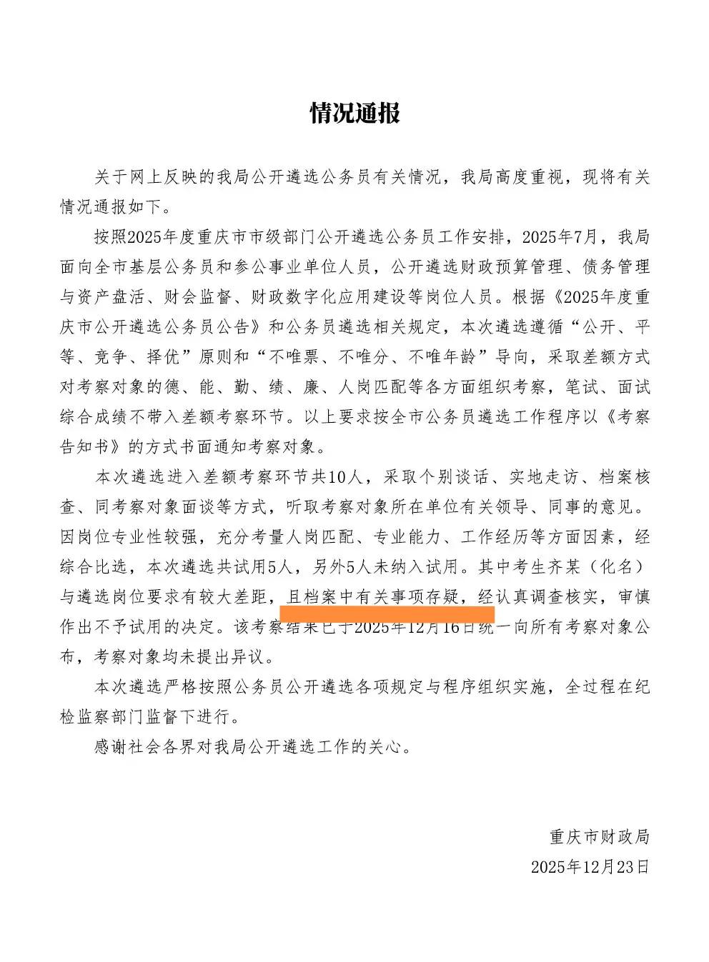 重庆市财政局“遴选”公务员(也就是在体制内基层单位内部招考),招五个,竟然笔试面试第一名被“淘汰”,家属“曝光”、瞬间爆🔥 [吃瓜群众]一大帮人都是“外行看热闹”,觉得同事不打“满分”、没有加分等“理由”很牵强,确实,今天官方通报出来,之前那些应该都是“说辞”而已,真正的关键点是——“档案中有关事项存疑”[石化]官方通报出这句话,极其罕见 [思考]“苦主”齐某,以后也就基本可以告别“遴选”这个赛道了
