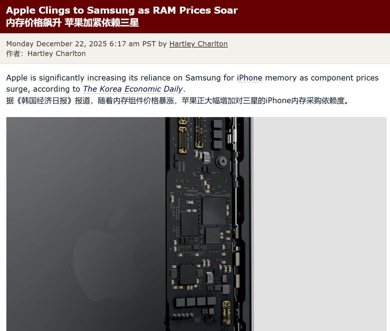 《韩国经济日报》报道,受内存价格快速上涨影响,苹果正扩大对三星 iPhone 内存的采购份额 ,预计 iPhone 17 的 DRAM 芯片中,三星供货占比将达 60%-70%,三星这回又要赚翻了。