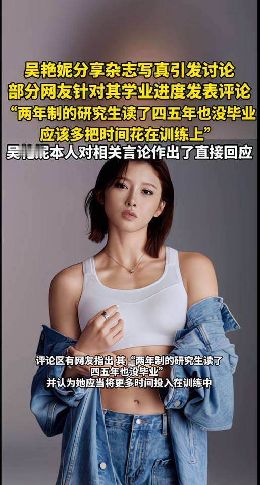 吴艳妮分享杂志写真却因研究生学业进度遭网友质疑,被指两年制研究生读了四五年未毕业、应多花时间在训练上,本人也已对此作出直接回应,赛场之外的话题争议再次将她推上风口浪尖。