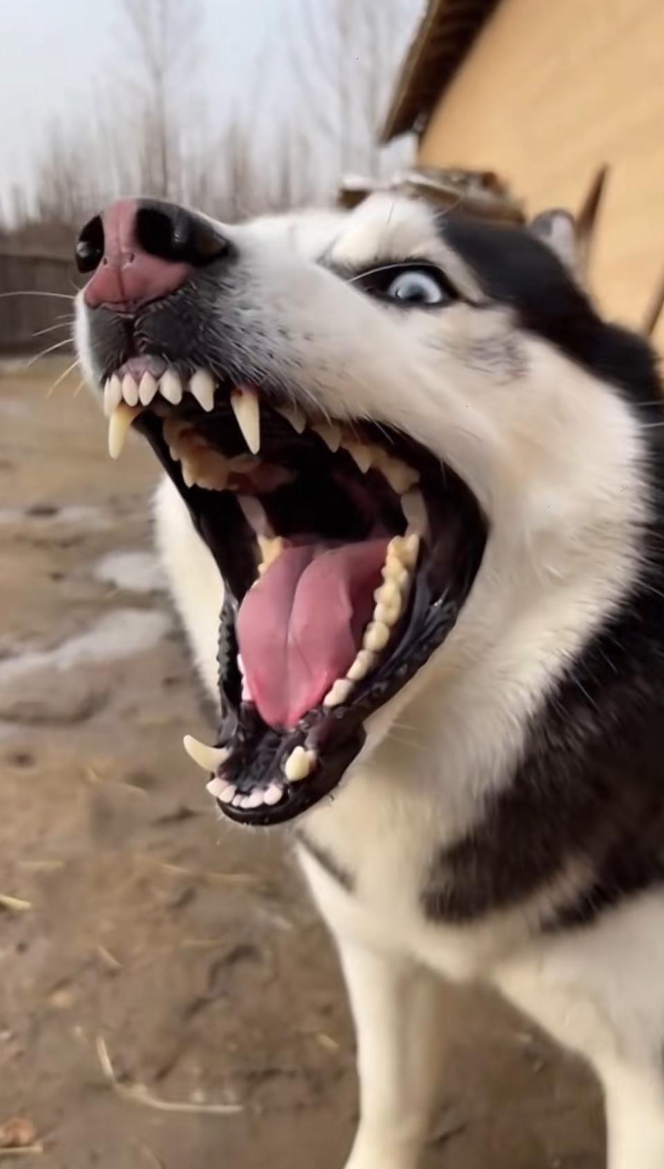 哈士奇大开嘴,露出锋利的牙齿,仿佛在咆哮!🐕😱