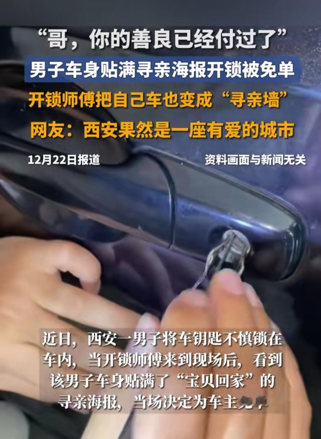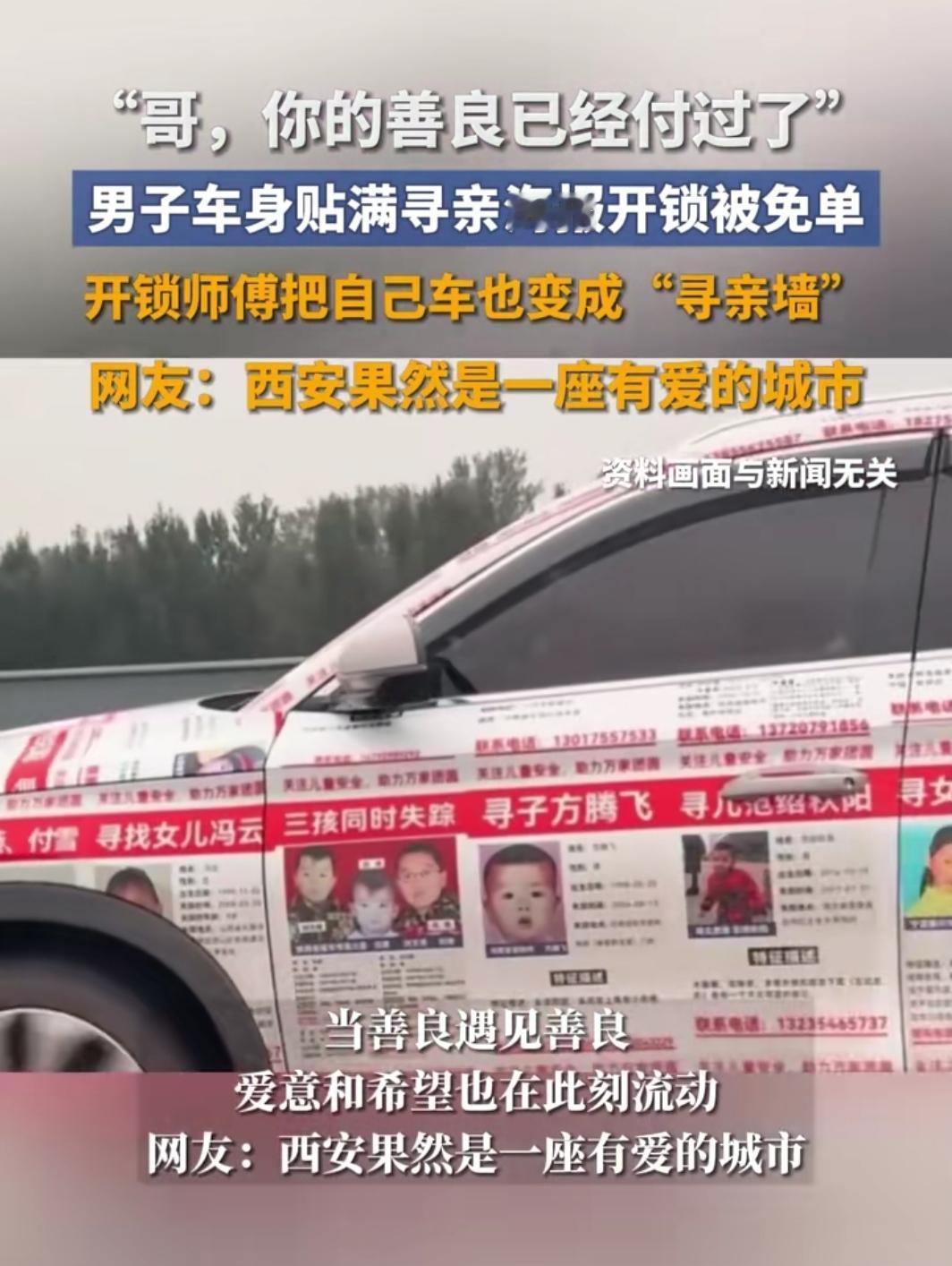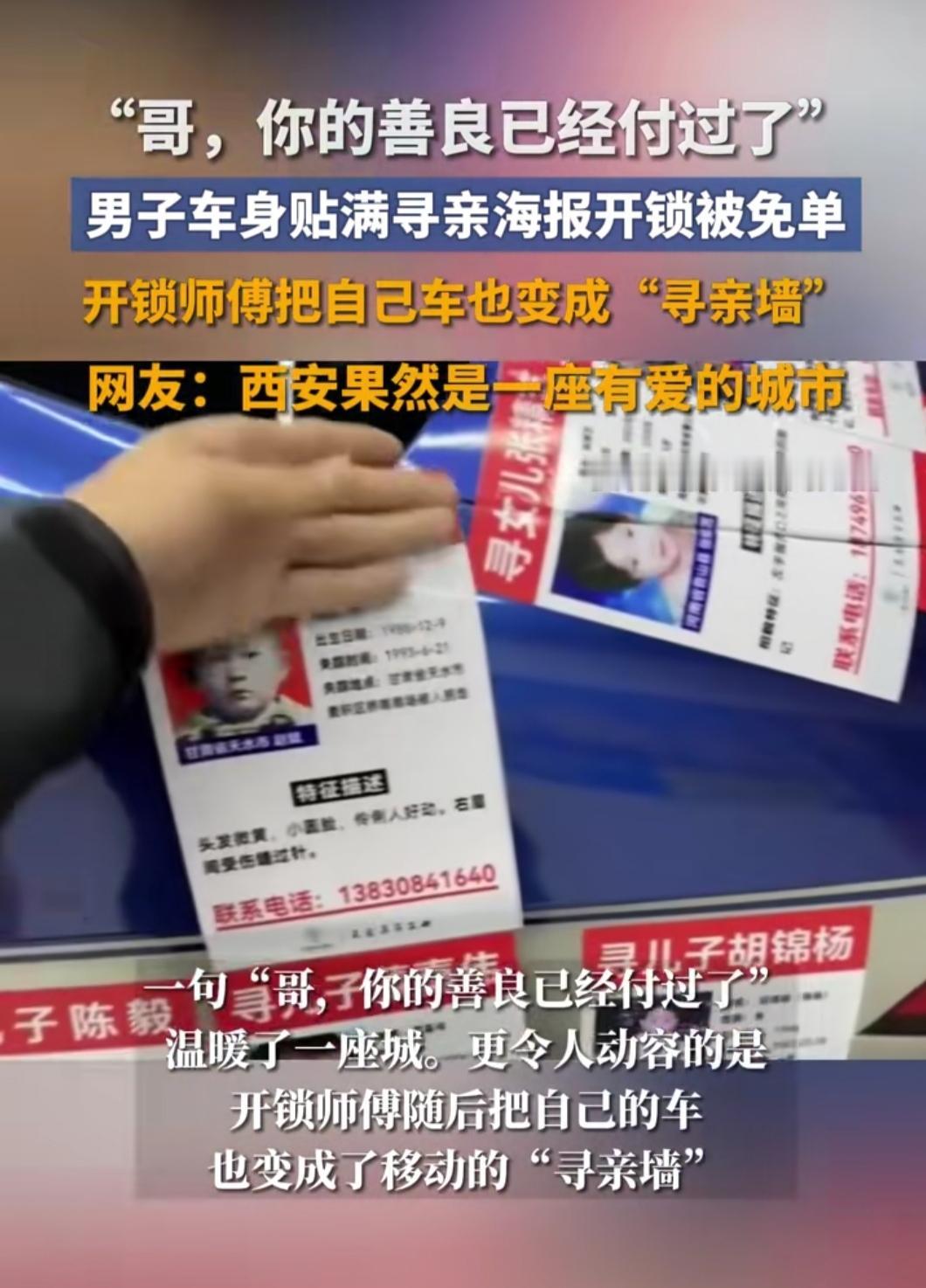 刷到西安这场双向奔赴的善意,眼泪突然就涌上来了——车主王先生开着贴满寻亲海报的车,不慎把钥匙反锁在车里,找师傅开锁时,师傅看清车身20多张卷边磨损的“宝贝回家”传单,沉默几秒后直接说:“哥,这锁我免费开,你的善良已经付过了。” 谁能想到,一次普通的开锁,成了善意的接力。王先生自费贴寻亲海报3年,跑遍各地帮走失孩子回家,这份不求回报的坚持,被开锁师傅记在了心里。更暖的是,师傅不仅退了提前支付的200元,还在店内设“寻亲信息角”,承诺给贴寻亲传单的车主半价服务,说“能多让一个人看到,就多一分希望”。 这世上最动人的,从来不是惊天动地的壮举,而是普通人之间的互相体谅与温暖传递。王先生用行动守护团圆的希望,师傅用善举回应善良,他们让我们相信,善意就像多米诺骨牌,只要有人轻轻推动,就会一路蔓延,照亮更多人的路。