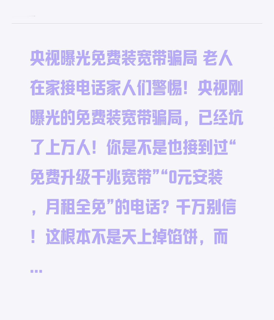 央视曝光免费装宽带骗局 老人在家接电话家人们警惕!央视刚曝光的免费装宽带骗局,已经坑了上万人!你是不是也接到过“免费升级千兆宽带”“0元安装,月租全免”的电话?千万别信!这根本不是天上掉馅饼,而是骗子挖好的大坑! 最近不少人都收到这类推销电话,客服嘴甜得像抹了蜜,说只要报身份证号、签个电子协议,就能免费装宽带,还送路由器、机顶盒。很多人一听“免费”就动了心,尤其是家里的老人,想着能给子女省点钱,二话不说就把信息全给了。 可装完没几天,怪事就来了:网速慢得像蜗牛,想看个高清视频都卡到爆;到了月底,手机突然收到几百块的扣费短信,说是什么“增值服务费”“设备租赁费”;想退订?客服直接失联,上门的工作人员更是翻脸不认人! 就在大家以为是宽带公司乱收费的时候,央视的调查结果让所有人惊出一身冷汗——这些所谓的“宽带客服”,根本不是正规运营商的人!他们是打着免费旗号的诈骗团伙,用低价设备冒充千兆宽带,再用霸王条款偷偷扣费,甚至还会倒卖用户的身份证信息,进行二次诈骗! 更可怕的是,这些骗子专挑老人、租房族下手,因为这类人群要么对网络套餐不熟悉,要么图省事不想跑营业厅。他们还会伪造正规的合同和公章,让人根本看不出破绽。有受害者算了一笔账,本来想省几十块月租,最后反而亏了上千块,真是赔了夫人又折兵! 看到这儿,是不是后背发凉?我们总想着占便宜,却忘了“天下没有免费的午餐”这句话。其实骗局的套路一点都不高深,无非就是抓住了大家贪小便宜的心理。 不管是免费宽带,还是免费送鸡蛋、免费领洗衣液,背后都可能藏着陷阱。尤其是家里的长辈,一定要多提醒他们,遇到陌生电话说“免费”,先挂掉!涉及身份证号、银行卡号的,更是要直接拒绝! 挣钱不容易,每一分钱都该花在明处。别让一时的贪念,变成骗子的“提款机”! 最后提醒大家:装宽带一定要去正规营业厅,远离一切“免费”的诱惑!觉得有用的,赶紧转发给家人朋友!