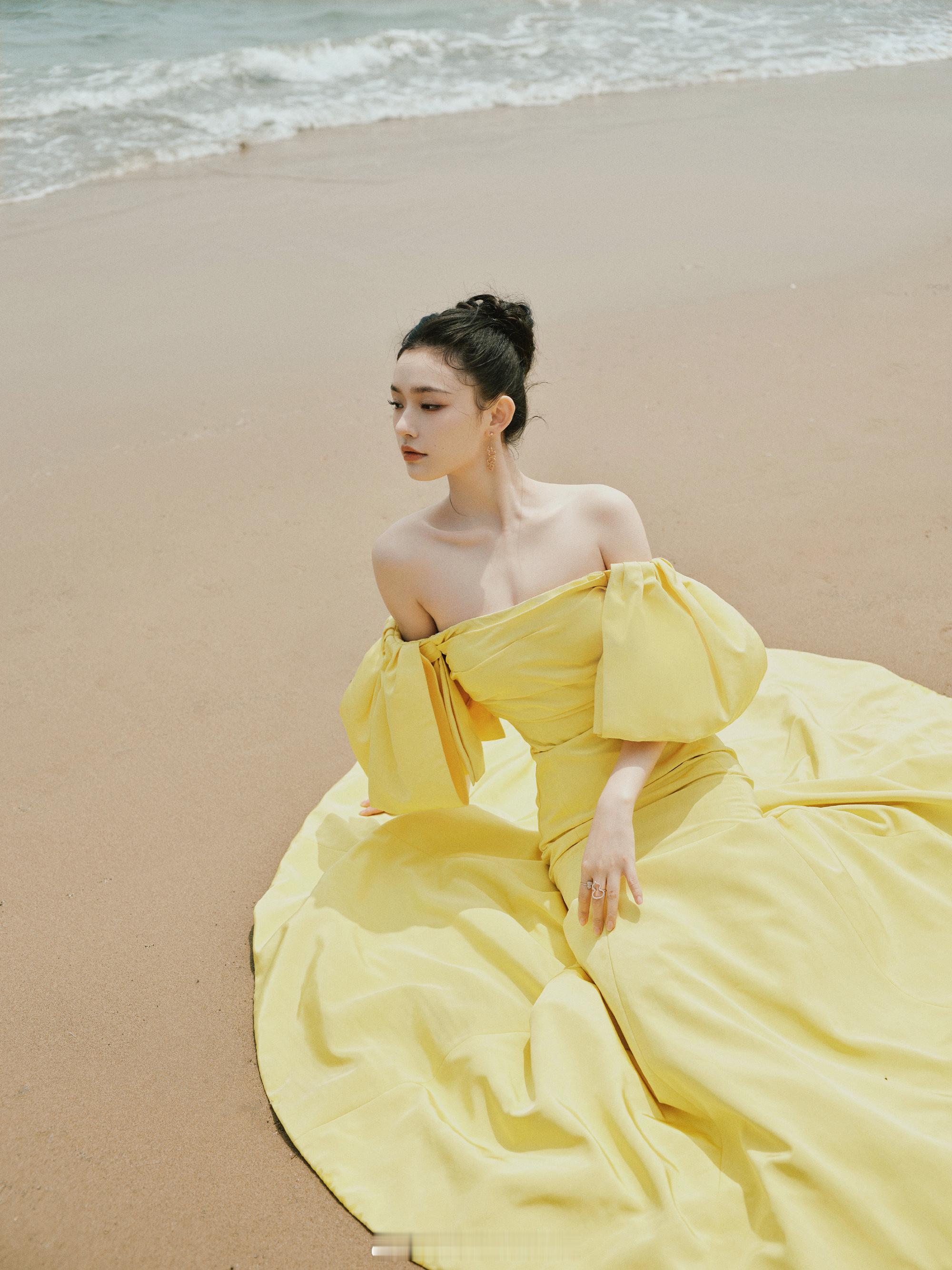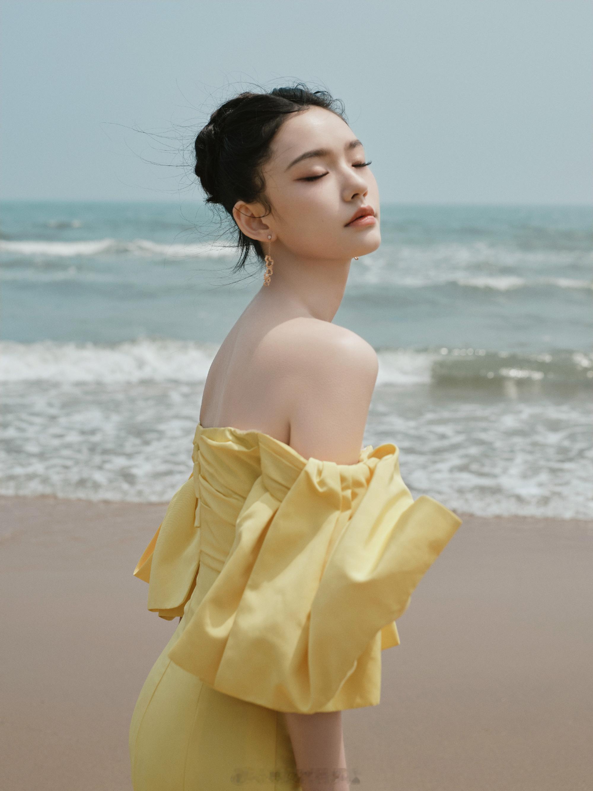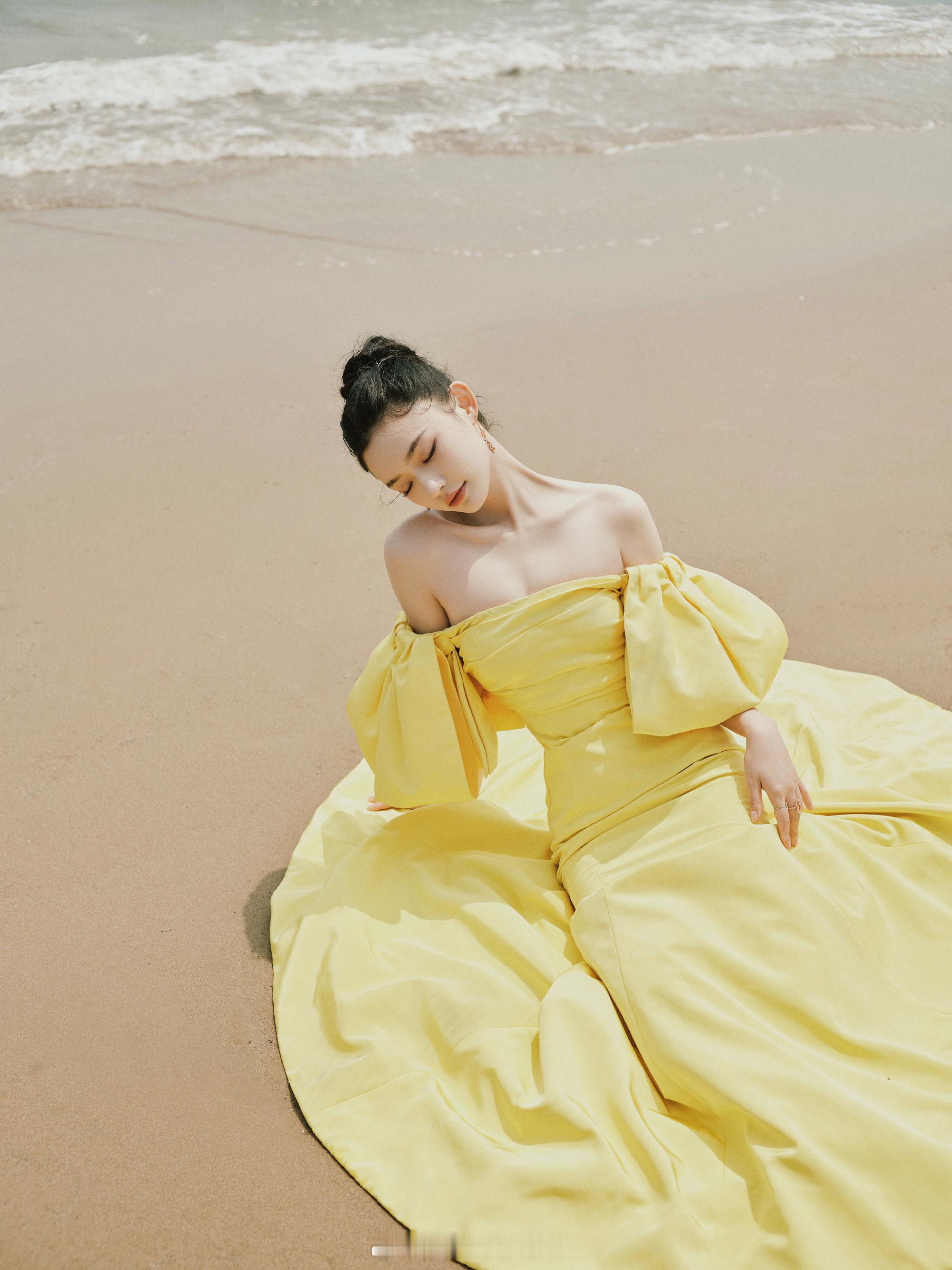 林允海滩美拍黄色抹胸裙浪漫甜美