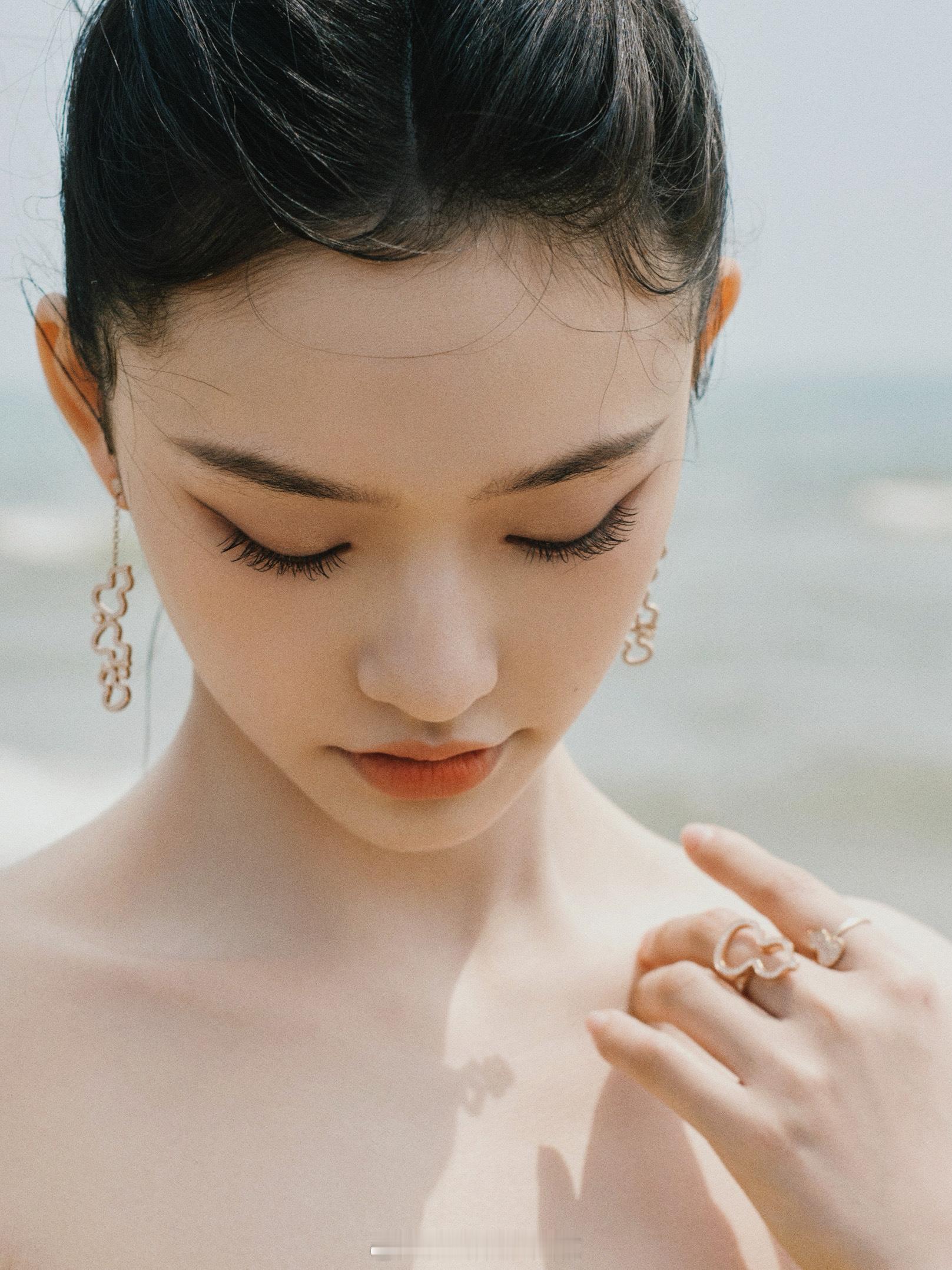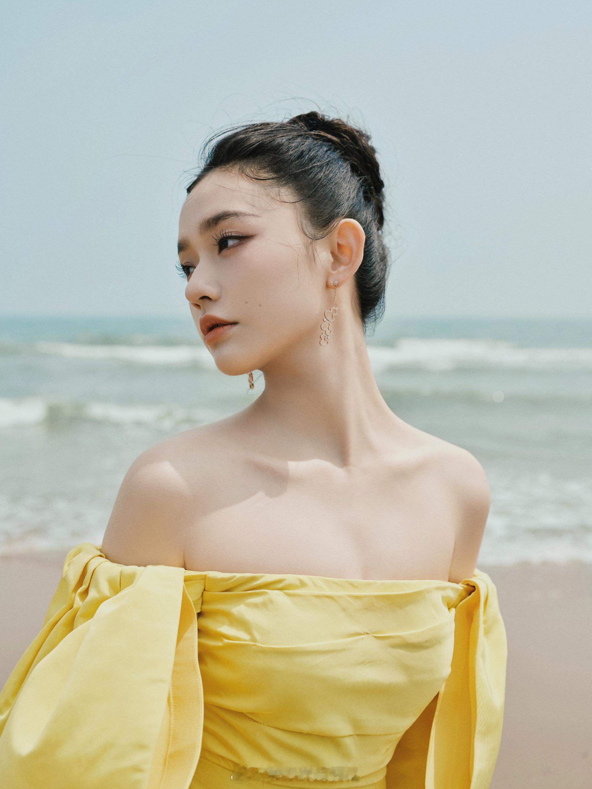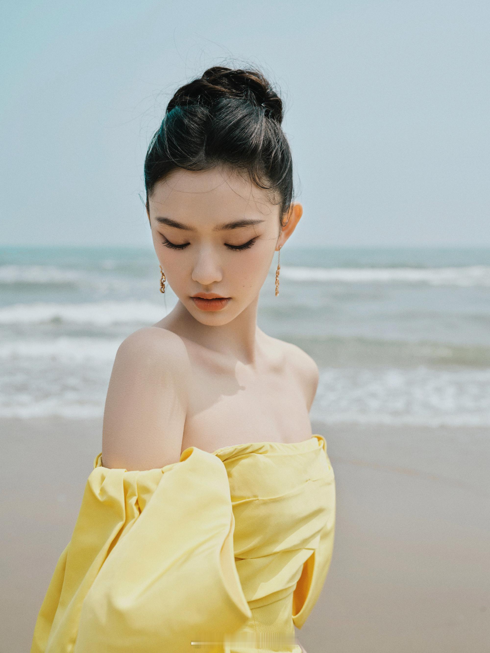 林允海滩美拍黄色抹胸裙浪漫甜美