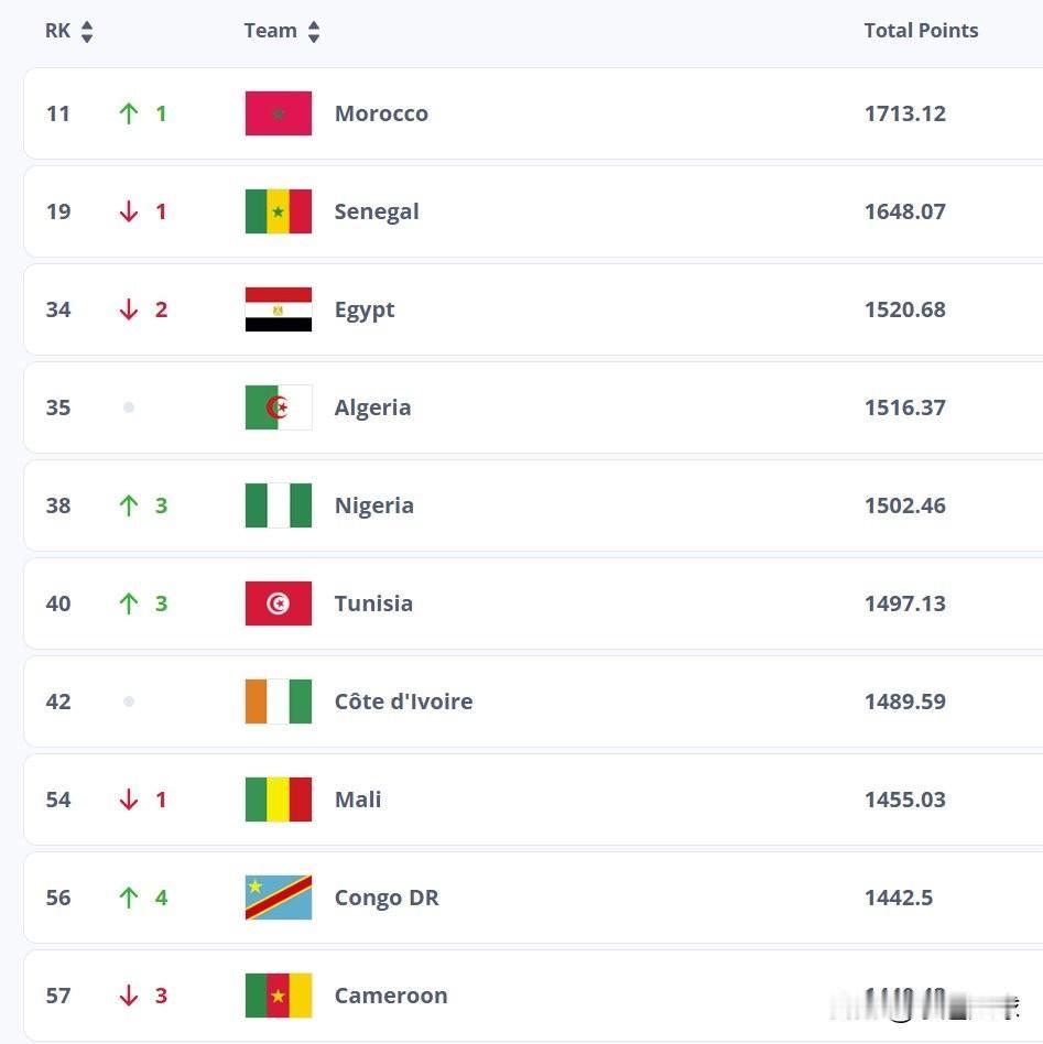 根据国际足联排名,2025年非洲国家杯参赛队伍排名前列的国家: 🇲🇦摩洛哥(11), 🇸🇳塞内加尔(19), 🇪🇬埃及(34), 🇩🇿阿尔及利亚(35), 🇳🇬尼日利亚(38), 🇹🇳突尼斯(40), 🇨🇮科特迪瓦(42), 🇲🇱马里(54), 🇨🇩刚果民主共和国(56), 🇨🇲喀麦隆(57) 值得注意的是,它们几乎全部位于该大陆的北部或西部。