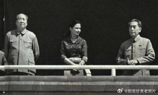 1970年,在天安门城楼上,西哈努克夫人莫尼列站在毛泽东、周恩来中间。