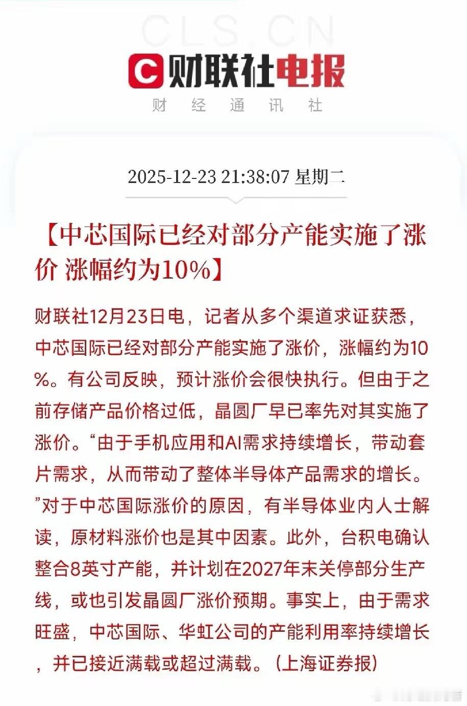 重大利好:中芯国际部分产能涨价10%,半导体成熟制程拐点或至财联社确认,中芯国际