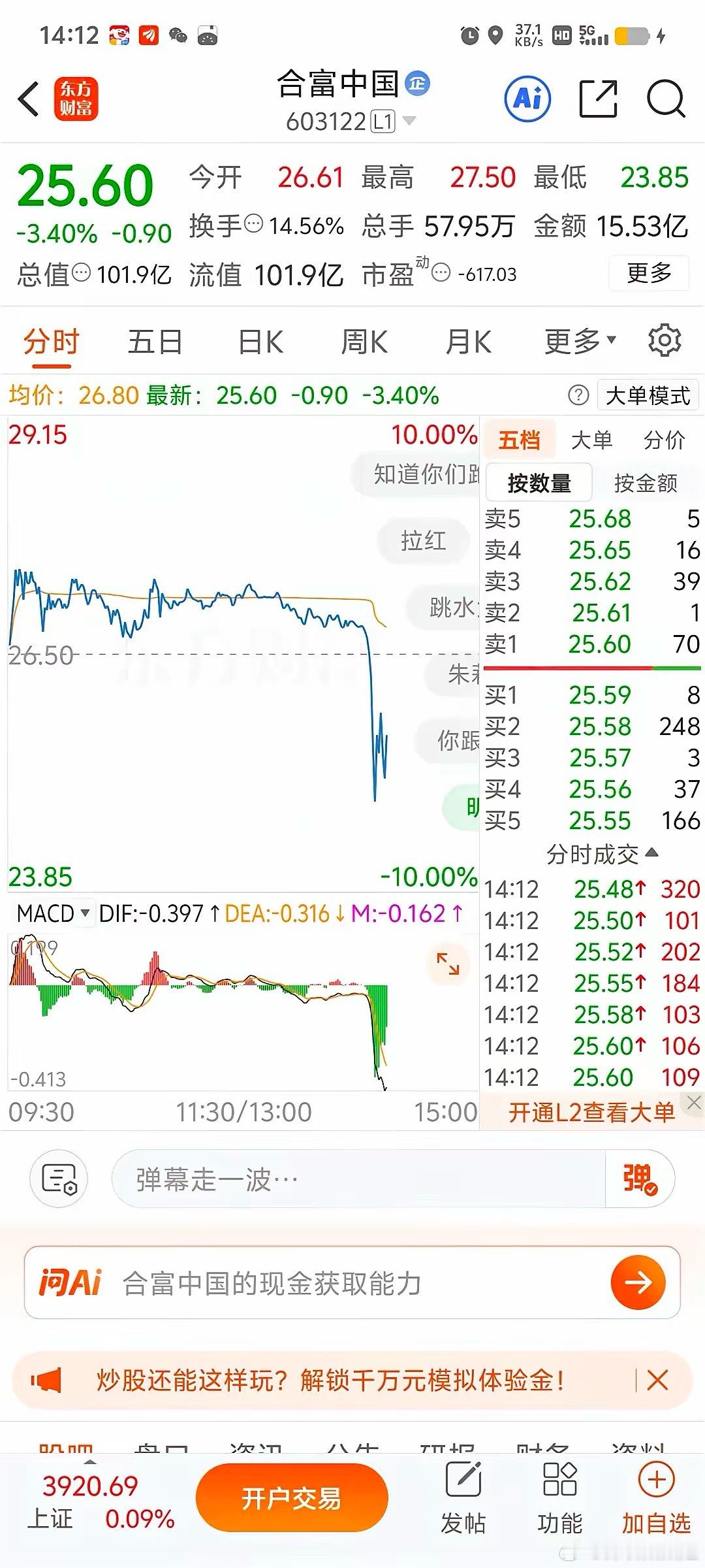 高位股午后集体跳水刚到14点整,高位股便集体跳水。高位股集体跳水行情持续,合富中国闪崩,触及跌停,平潭发展、东百集团、百大集团也全线走低。