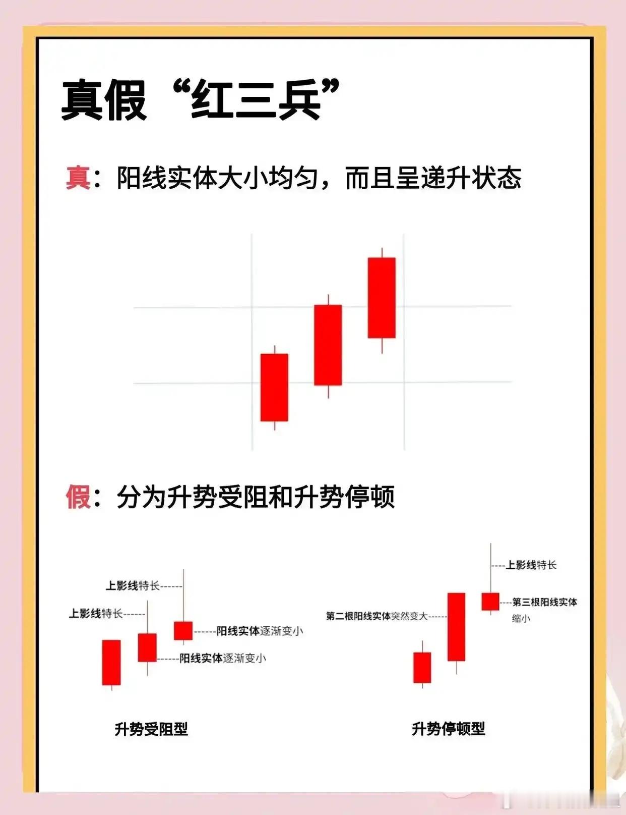炒股必学的K线形态“红三兵”来了!图里把红三兵的定义、四大特点,还有真假红三兵的区分都讲得明明白白,甚至连阳线的基础结构都标注好了,新手也能轻松看懂。学会分辨真假红三兵,对判断短期上涨信号超有用~老规矩先点赞后观看,谢谢大家支持。声明:本文仅为K线技术分析知识分享,不构成投资建议,股市有风险,投资需谨慎。