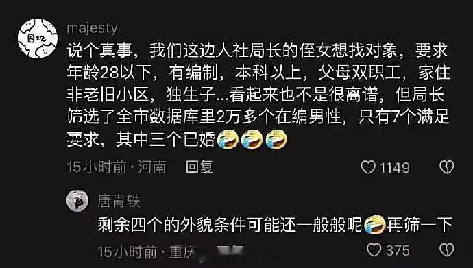 县城体制内女性找对象越来越难 把相亲市场上的择偶要求量化为高考成绩做个不恰当的比喻吧,如果县城没在体制内打工的女孩,可能要求相亲男性每门课至少比自己高几分,总分可能也就多几十分。一个211,一个普通高校本科,似乎也说的过去但到了体制内的女孩,择偶要求对方每门课比自己搞20分、30分,总分至少高出100多分、200分,那就没法了,这两人绝对不是同一类人,说白了就不是一个层次的,一个职业学校的非要找双一流的