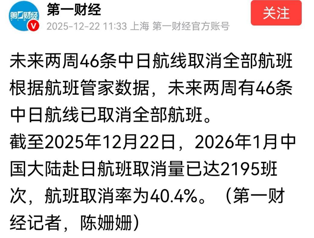 全部取消!这是对日经济人民战争的重大胜利,未来两周46条中日航线取消全部航班。 之前还有消息说中日航线取消率大概40%,没想到才过没多久,未来两周直接拉满到100%,46条核心航线全停,2195个航班说取消就取消,涉及上海、东京、大阪这些中日核心城市在内的38个城市,相当于直接切断了这些城市之间的空中联系。 能有这么彻底的效果,不光是老百姓自觉抵制,组织起来的力量才是关键。要是光靠零散的个人行动,很难达到这种一刀切的彻底程度。 这也让大家看清了,真正的人民战争,既有发自内心的自觉,更有章法分明的组织,两者结合起来,才能形成这种让对方无力招架的冲击力。 说到底,这一切的根源还是日本方面自己找事。高市早苗一伙人在台湾问题上搞武力挑衅,本来就突破了底线,可他们非但不收敛,反而变本加厉地作死。 先是高市早苗自己在国会公然放话,把台湾问题和日本所谓的“存亡危机事态”绑在一起,暗示要出动自卫队介入,完全无视中日之间的政治共识和历史定论。 紧接着,她手下的自卫队人员更是狂得没边,居然敢放话要击沉福建舰航母,这种嚣张气焰跟当年的日寇简直如出一辙。 更离谱的是,日本政府里还有高管跳出来鼓吹要让日本拥有核武器,这已经不只是针对中国的威胁了,更是把整个世界的安全当儿戏,给日本人民也签了份死亡之约。 他们大概以为搞这种强硬姿态能捞到政治资本,却压根没掂量掂量自己的经济底子能不能扛住反噬。 要知道,马上就到元旦和春节了,这本来是日本旅游业一年中最赚钱的旺季,往年这个时候,成田、关西这些机场全是中国游客,免税店、餐饮、住宿行业全靠这段时间冲业绩。可现在46条航线一停,中国游客根本去不了,日本旅游业直接被釜底抽薪。 已经有日本经济学家算过账,就这波中国游客的锐减,大概率会让日本GDP拉低0.36%,经济损失合计能达到2.2万亿日元,换算成人民币差不多1000亿,这可不是小数目。 而且这影响还不只是局限在旅游业。航空业首当其冲,日本航空和全日空这两大航空公司的股价近期已经累计下跌超过15%,接下来还得面临运力减半、员工闲置的难题。 大阪心斋桥那些靠中国游客撑场面的免税店,已经出现了单日营业额暴跌70%的情况,不少中小旅游企业和餐饮商家都开始发愁能不能撑过这个冬天。 更关键的是,这种负面效应还在往其他行业扩散,日本国内那些依赖中日贸易的企业,也开始感受到供应链收紧的压力。 民众的不满已经压不住了,东京街头都出现了抗议的人群,大家举着标语要求政府停止拿国家经济冒险,别用纳税人的钱搞政治投机。 最新的民调数据也很能说明问题,接近六成的日本民众都担心中日关系恶化会拖累经济,高市内阁的支持率也跌破了40%的警戒线,执政根基都开始动摇。 之前高市早苗还跑到美国去求支持,折腾了四十多天,结果美国那边只轻飘飘地说了句“关注进展”,压根没打算帮她撑腰,这下她是既没捞到外交面子,又丢了经济实惠,彻底陷入了两难境地。 日本经济本来就复苏乏力,现在又主动把中国这个重要的贸易伙伴和游客来源地推开,纯属自断生路。 他们大概忘了,中日经贸关系不是单向的依赖,而是相互关联的,可他们偏偏要在核心利益问题上挑衅,那就得承担相应的后果。这次46条航线全取消,就是最直接的回应,也是对日经济人民战争的重大胜利。 高市早苗一伙人沿着日寇的老路往下走,以为靠强硬就能唬住人,却不知道现在的中国早已不是当年任人欺凌的样子,中国人民的凝聚力和组织力,也不是他们能想象的。 想拿台湾问题做文章,想靠挑衅转移国内矛盾,最终只会搬起石头砸自己的脚。这波航线全取消只是个开始,要是日本方面还不认清现实,继续在错误的道路上狂奔,等待他们的只会是更严重的孤立和衰退。 现在的局面很清楚,不是我们要跟日本过不去,而是他们先破坏了双方合作的基础。想要恢复航线、重建经贸关系,主动权在日本手里,关键就看他们能不能撤回那些错误言论,停止干涉中国内政。 否则,这种经济上的反噬只会越来越强烈,所谓的“强硬”最终只会变成砸向自己的锤子,让整个日本为他们的作死行为买单。 而我们这场经济人民战争的胜利,也再次证明了,只要全国人民团结一心、组织有序,就没有我们扛不住的压力,没有我们守不住的底线。