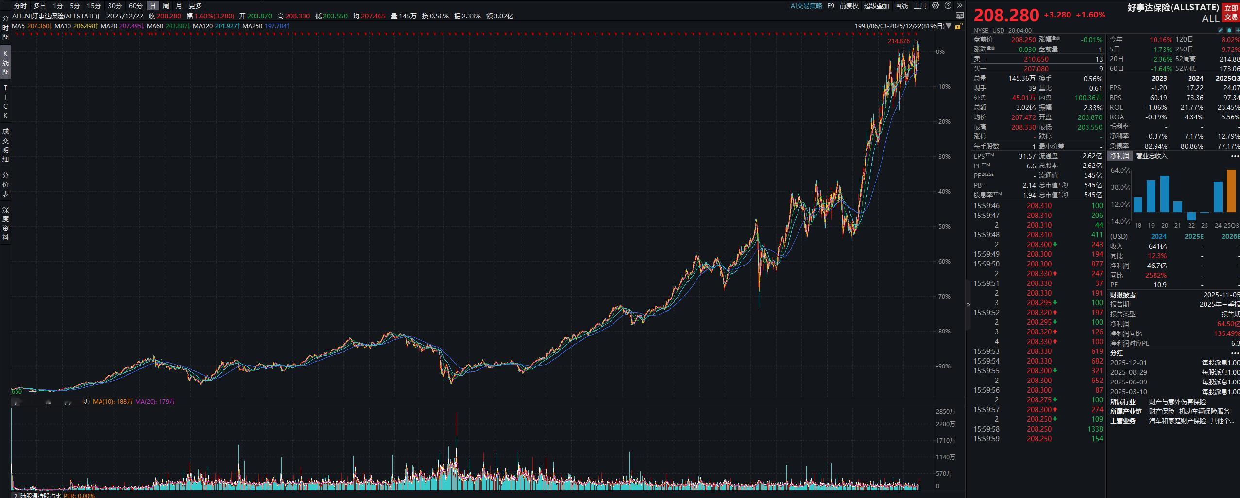 好事达保险公司(The Allstate Corporation,股票代码:ALL.N)1、1931 年 4 月 17 日,当时作为西尔斯罗巴克公司(Sears, Roebuck & Co.,2018年破产)的一个部门正式成立,最初专注于汽车保险业务。此后开始快速发展。1993 年 6 月 20 日,好事达 IPO上市,西尔斯出售了公司 19.8% 的股份,1995 年 6 月 30 日,西尔斯将剩余 80% 的股份全部剥离,向股东分配了 3.505 亿股好事达股票,好事达正式成为一家完全独立的上市公司。2、好事达保险主要在美国和加拿大从事财产和意外伤害保险业务。具体来说,汽车保险是好事达的核心业务, 2025 年美国汽车保险市场中占有约 10.2-10.7% 的市场份额,排名第四。房屋保险是好事达的第二大核心业务,在 2024 年美国房屋保险市场中占有约 8.97-9.26% 的市场份额,排名第二。3、公司市场份额中等,在技术创新上发力,远程信息处理技术有一定的优势,定价更精准,同时AI 和大数据分析提升了风险评估能力。不过领先保险公司(Progressive,也是给大牛股)这方面投入也很大,据报道通过技术创新将承保成本降低高达 40%。另外的竞争对手就是巴菲特的波克夏及下属的盖可保险了。4、2024-2025 年的战略转型具有里程碑意义,公司通过出售雇主自愿福利业务(20 亿美元)和团体健康保险业务(12.5 亿美元),实现了业务的重新聚焦,将资源集中于具有核心竞争优势的个人财产意外险领域。5、战略转型导致盈利能力大幅改善,综合成本率从 2023 年的 103.2% 改善至 2024 年的 97.2%,2025 年前三季度进一步降至 80.1%总结:美国财产意外险市场State Farm、Progressive、Geico 和 Allstate 四大巨头合计占据约 60% 的市场份额,两家私有化(其中Geico很早被巴菲特买退市了),都是非常好的资产,高盛推这个股票没什么毛病。不过这个股票属于平稳发展的股票,未来十二个月看230刀是比较稳妥的设定。