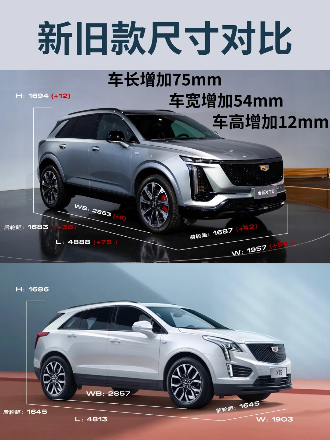 ✅全新XT5升级至XT6的宽架构,车宽增加了54mm,轮距也增加了42mm,成为同级车中最宽的一款,并接近大型豪华SUV的尺寸。这一变化不仅提升了车辆的内部横向空间,更在视觉上使新车比老款大了一圈。车长增加了75mm,车高也提升了12mm,更加凸显了SUV的力量感。