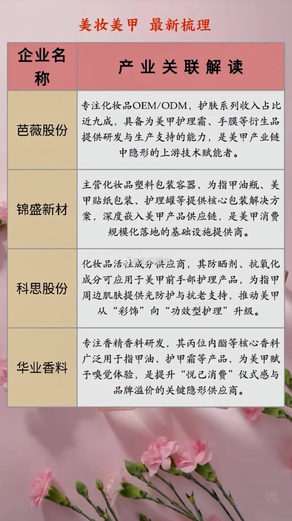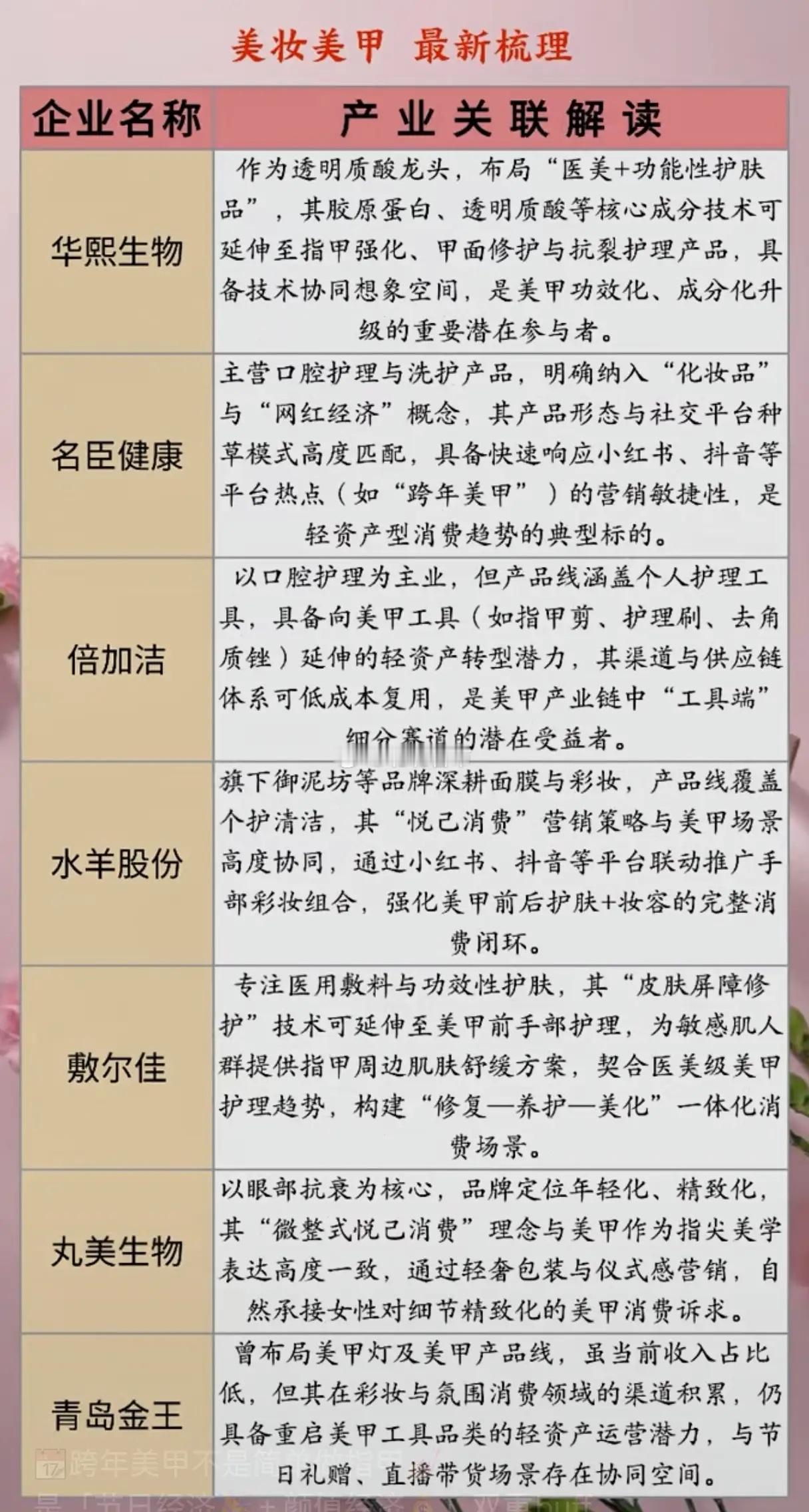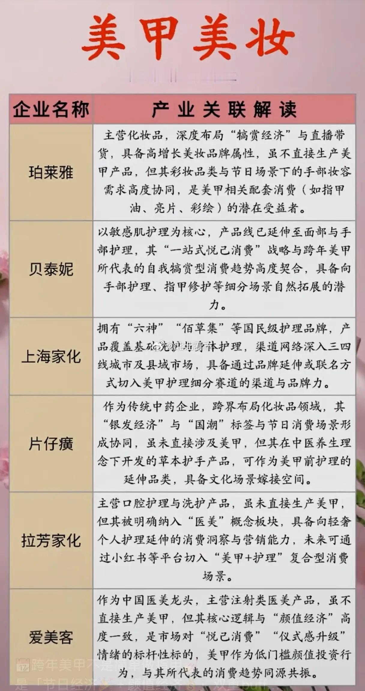 年底美甲美妆消费爆火,哪些企业能分走消费红利?年底节日消费热潮推动美甲美妆赛道迎来旺季,珀莱雅、贝泰妮等二十余家企业从品牌、供应链、上游技术等维度切入美甲美妆产业链,凭借与“悦己消费”“仪式感消费”的契合度,成为这波消费红利的潜在受益者,而不同企业的布局逻辑也折射出美甲美妆产业的多元化发展趋势。品牌端企业依托消费场景协同实现需求绑定,珀莱雅深耕彩妆与直播带货,其指甲油、亮片等美甲配套彩妆在节日手部妆容需求中销量走高;贝泰妮以敏感肌护理为核心,手部护理产品线与跨年美甲的“悦己消费”趋势高度契合,具备向指甲修护细分场景拓展的潜力;上海家化凭借“六神”“佰草集”的渠道优势,可通过联名快速切入美甲护理赛道;爱美客虽主营医美针剂,但作为“颜值经济”标杆,与美甲的低门槛颜值投资需求形成趋势共振。华熙生物则将透明质酸技术延伸至指甲强化、甲面修护,成为美甲功效化升级的核心参与者,水羊股份通过抖音、小红书联动推广手部彩妆组合,打造“美甲+护肤”的完整消费闭环。产业链配套企业则从工具、材料端挖掘机会,倍加洁依托个人护理工具产能,可低成本延伸至美甲剪、去角质锉等工具品类;青岛金王曾布局美甲灯产品线,凭借彩妆渠道积累有望重启美甲工具业务。上游供应商更是成为美甲产业的“隐形推手”,芭薇股份作为化妆品OEM/ODM企业,能为美甲护理霜、手膜等衍生品提供研发生产支持;锦盛新材的化妆品包装容器覆盖指甲油瓶、美甲贴纸包装,是美甲产品规模化落地的基础;科思股份的防晒、抗氧化成分用于美甲前手部护理,推动美甲从“彩饰”向“功效型护理”升级;华业香料的香精则为指甲油、护甲霜赋予嗅觉体验,提升美甲消费的仪式感。年底节日经济催生的美甲美妆消费热潮,本质是“悦己消费”的集中释放,而产业链上的企业通过场景协同、技术延伸、供应链配套等方式,实现了与美甲美妆需求的深度绑定。随着年轻群体对细节精致化的追求升级,美甲美妆产业还将持续向功效化、场景化发展,提前布局的企业也将在消费红利中占据更有利的位置。