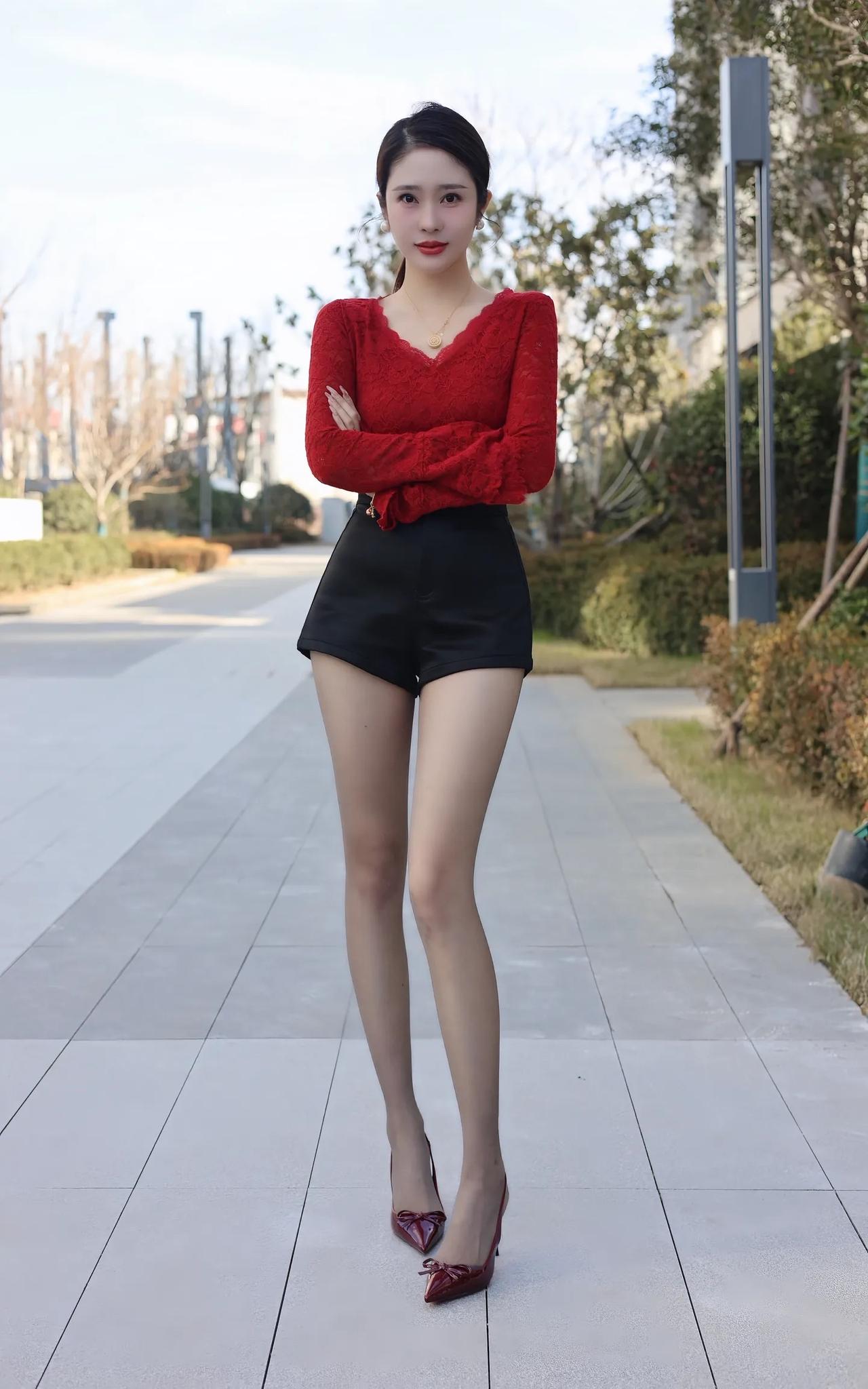 红衣少女漫步在林荫小道,时尚与自然完美融合。