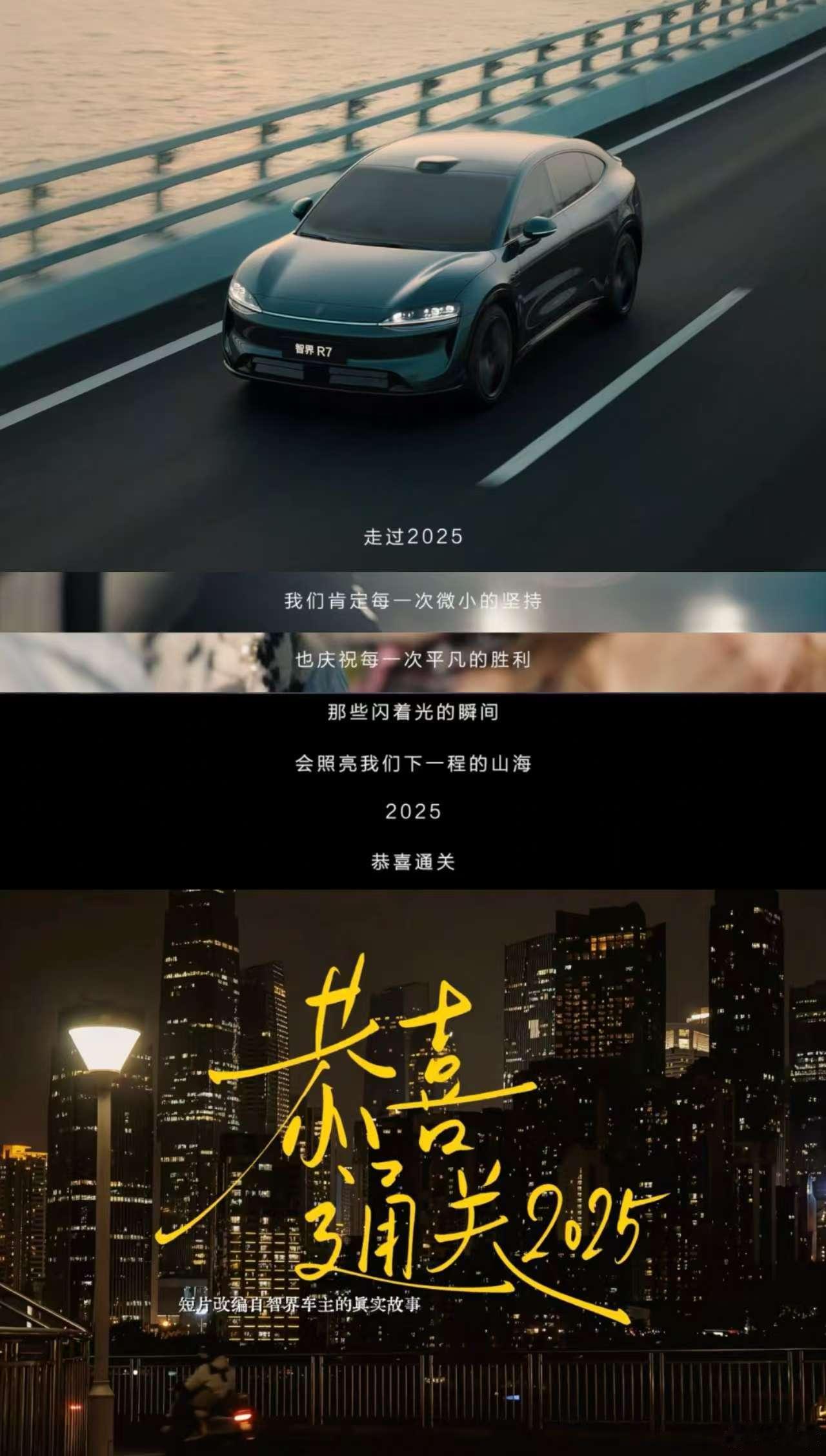 和智界一起通关的2025近日,智界联合三联生活周刊推出年度暖心大片《恭喜通关2025》。视频通过洞察当代年轻群体的真实情绪,以“肯定自己的每一次成长”为内核,讲述智界陪伴用户经历一年中或高光、或平淡、或低谷的不同成长阶段。智界作为被越来越多年轻人选择的品牌,以超大空间、智能黑科技等实力为底气,化身通关路上的“最强辅助”,在宠物出行、家庭旅行、带娃出门等日常生活场景,从容应对各种需求,而这份贯穿全年的陪伴,更让年轻人在每一次前行中看见自己的成长。这部跨界大片既是智界对社会情绪的精准捕捉,更是智界与年轻人精神共振的生动诠释。智界R7智界S7