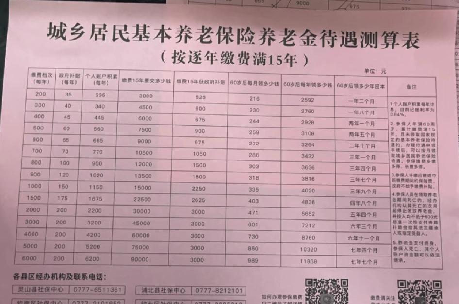 帮妈妈补缴广西城乡居民养老了。 今天去人社局问了城乡居民养老,60岁前是可以补缴 城乡居民养老保险 ,也可以提档补缴,不管是往年补缴或者提缴,都没有政府补贴了,有条件的最好是按最高档补缴,拿到的养老金就会高。领多少养老金主要是看自己缴纳的金额总数,比如图片里缴纳总数有9万的,预计每月领取900➕养老金,还是挺划算的。