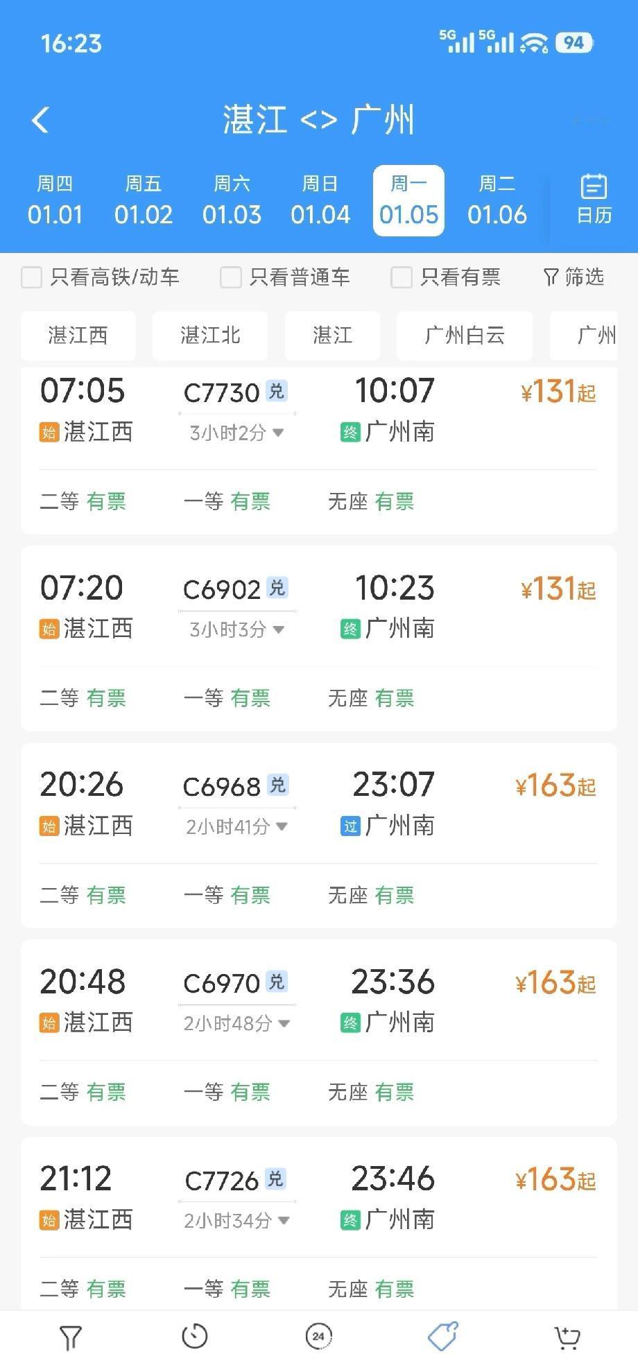 26年1月5日起湛江西动车调价低至5.1折131元 铁路12306显示湛江西往广州南方向动车组调价,折扣票价车次增多。最低票价131元低至5.1折。其中131元票价2趟车,163元票价4趟车,185元票价达到10趟车。