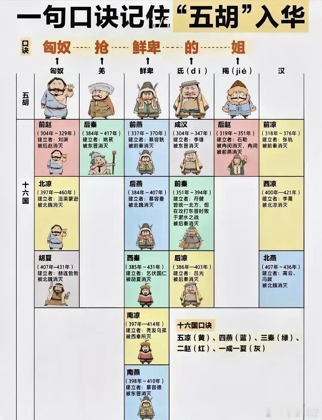 五胡乱华这段历史,有个超有趣的口诀能帮咱记住。“五胡”指匈奴、羌、鲜卑、氐、羯,口诀就是“匈奴抢鲜卑的姐”。西晋时,原本住外边的“胡人”和汉人融合,街上胡人随处可见。可朝廷不争气,于是“五胡”各种造反、建国家。这时期拿得出手的有十六国,速记口诀是“五凉、四燕、三秦、二赵、一成一夏”。像匈奴人刘渊揭开五胡乱华序幕,鲜卑建立西燕等政权,羯族虽称霸一时却因残暴被灭。有了这些口诀,记这段复杂历史就轻松多啦!历史生活手记