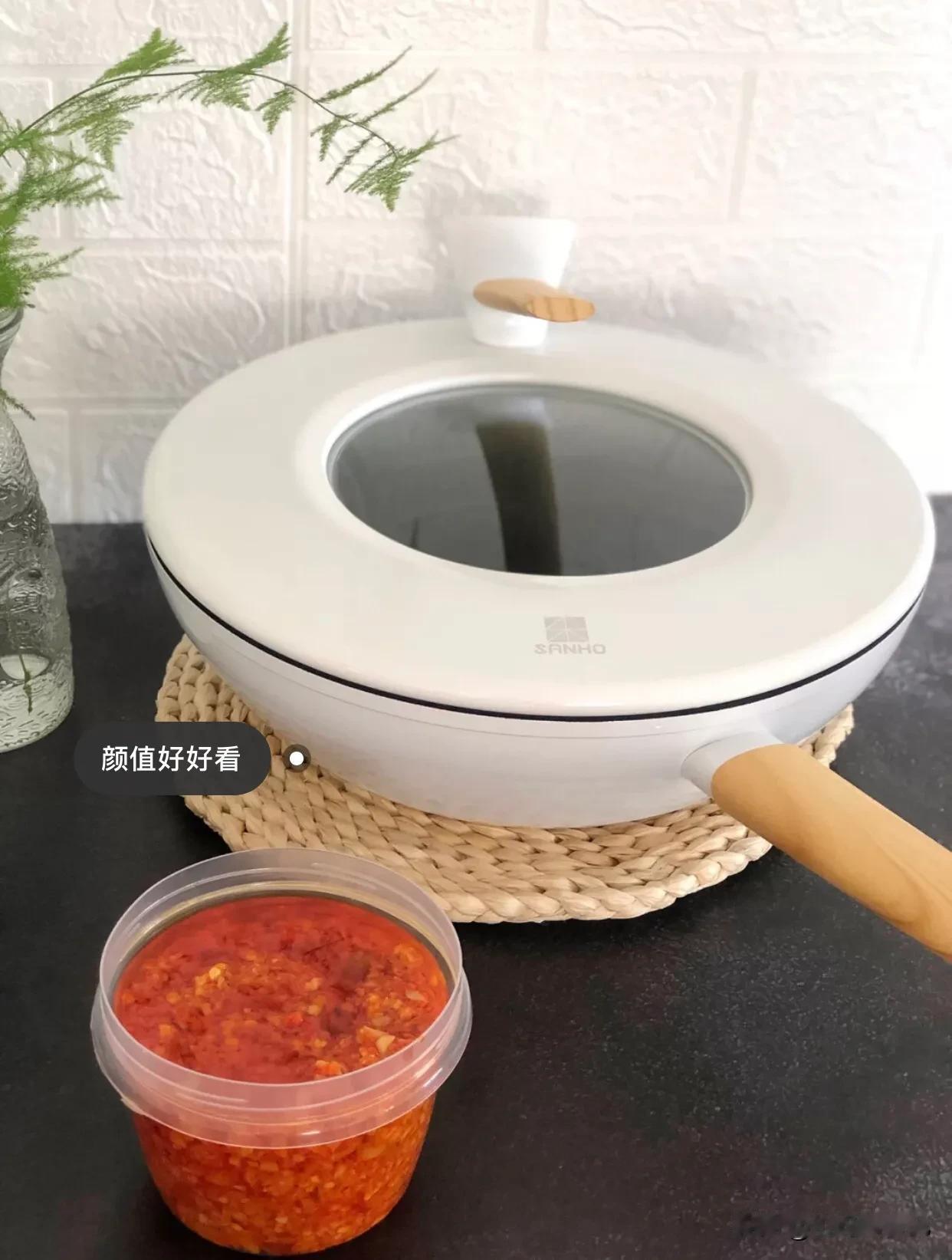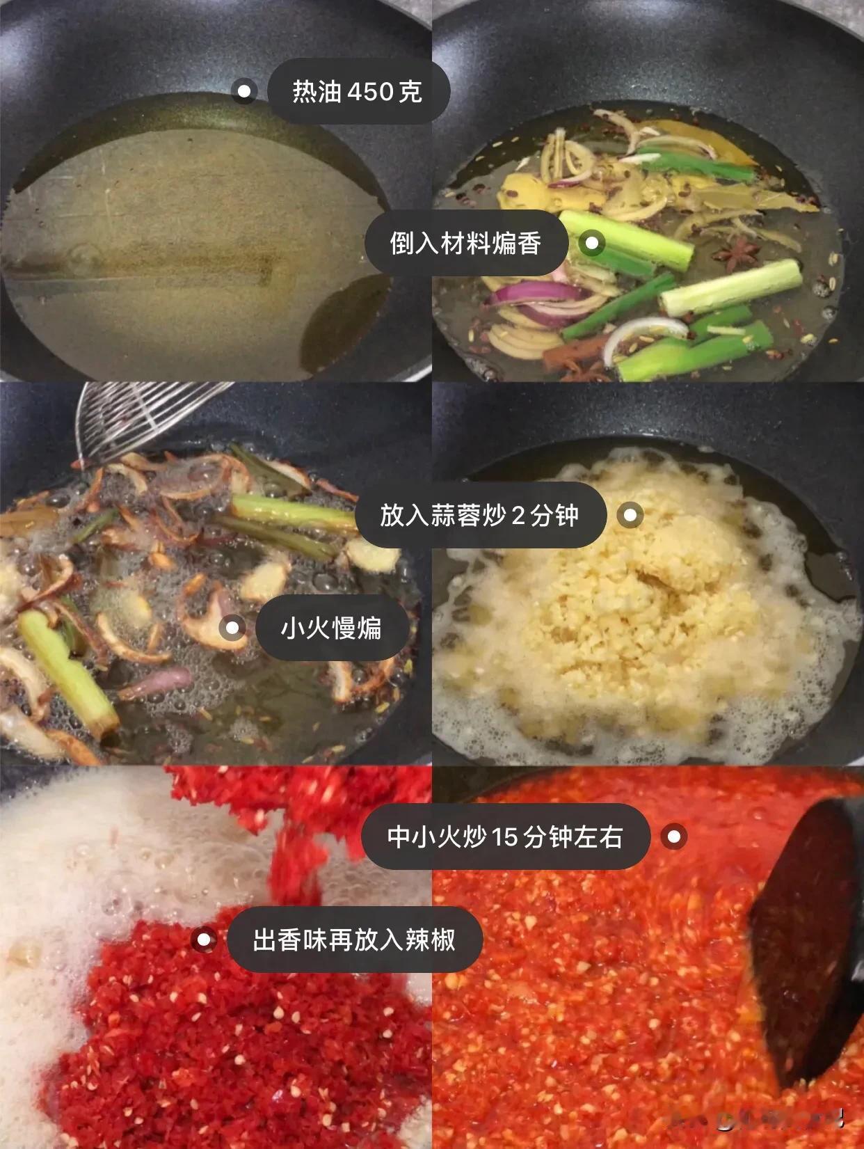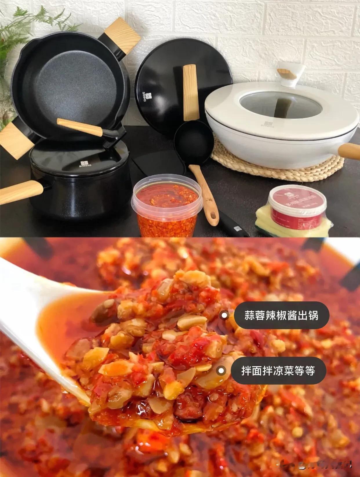 ㊙️快手蒜蓉辣椒酱做法,好吃又简单 🌴这个蒜蓉辣椒酱的做法比较快,所以特别适合我这样的懒人做,爱吃的来尝尝,出锅后的那个香味!那叫一个香,满屋子飘香的那种!想吃就自己做吧! ✅食材: 辣椒1000克,花生米200克,食用油450克,蒜260克,酱油1勺,白酒1勺,白芝麻30克,白醋1勺,桂皮1块,黄豆酱2勺,八角2个,花椒粒2克,姜15克,小茴香1克,精盐25克,葱30克,香叶3片 ✅做法: 1、辣椒洗净控水后去蒂,然后切段放入料理机打碎,蒜瓣同样打成蒜蓉 2、锅中少许油放入花生炒熟,去皮压碎,白芝麻已经炒好的 3、接下来开始做辣椒酱,锅中倒入450克油热1分钟,放入配料,洋葱,大葱段,姜片,桂皮,香叶,花椒粒,八角,小茴香炸香捞出留底油 4、放入蒜蓉炒2到3分钟炒香,接着放辣椒碎中火炒15分钟左右 5、然后放入一勺酱油,二勺黄豆酱炒香,倒入花生和芝麻,再加入白醋一勺去辛辣,高度白酒一勺增香,加入25克盐左右(约2勺)翻炒片刻即可出锅,蒜蓉辣椒酱就做好了。 自己做的辣椒酱又香又好吃,可以吃上十天半月了,前两天我又没忍住入了中餐厅里面的同 款三 禾锅一套,看中它耐磨又耐刮清洗方便!对于常做饭的我很实用,全覆底导热快不跑油,受热均匀,我一只手轻松的可以颠锅,可视锅盖美观大方,又可以清楚的瞧见锅里的美食,越看越好看呢@头条美食 @微头条
